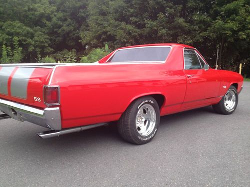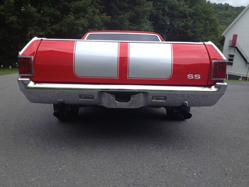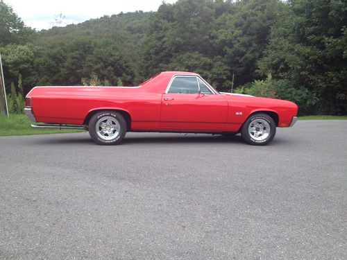 Up for auction is a beautiful torch red 1970 Chevrolet El Camino! This is a frame on restoration. Vehicle needs someone to make the few minor finishing details to. We have been working on this car for quite some time now and have no time to finish. This car needs the radio installed, blower motor wired in washer bottle plumed windshield wipers installed. These are the minor things that are left to be done. We have sandblasted the firewall and front portion of the frame down to bare metal and repainted. Vehicle has been completely gone over and repainted with PPG Deltron series Torch Red code 4230 and cleared with PPG DCU 2021. The paint is amazing as you can see in the pictures. The SS stripes are vinyl. The wiring has all been updated with Painless wiring harness 14 circuit wiring harness and updated fuse panel. The motors is a 350 Chevrolet with roller rockers Eldlebrock intake and carburetor. New headers and exhaust have been installed. The motor has been gone over and updated with a single wire alternator and new power steering pump. New fuel lines brake lines have been installed along with calipers and rotors, shoes were replaced in the rear as well the emergency brake needs the cable from the rear drums to the front installed we have one but it was sent in too short. Centerline racing wheels which give the right pop to the car. The El Camino runs and drives starts right up. As stated before the large ammount of work is completed on this car just some minor details to finish on this.. Perfect way to get into a hot rod. Still a few minor things for you to work on but sill able to dive. A MUST SEE car! We can help with delivery of vehicle withing reason of where we are located such as a 100 mile radius. More than welcome to come and see the car person at anytime. which we encourage. Please feel free to ask any questions as we will be more than willing to help!