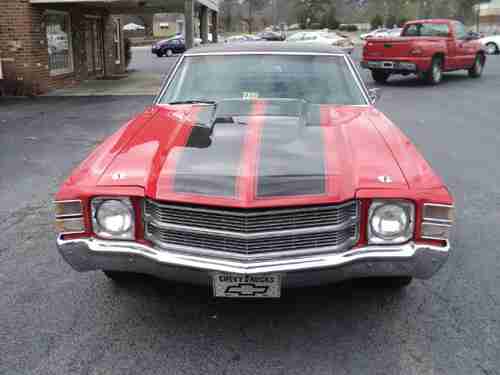 THIS 1971 EL CAMINO IS IN ABSOLUTELY INCREDIBLE, STUNNING RESTORED CONDITION. WITH A RED WITH BLACK STRIPING AND NICELY RESTORED INTERIOR. THIS IS A CLASSIC CHEVY IS SIMPLY VERY NICE AND STRAIGHT. POWER STEERING, POWER BRAKES, CHROMED BUMPERS, CHROME GRILL, AFTERMARKET WHEELS AND STEREO.RIDES AND DRIVES GREAT. IN PICTURES SHOWING SMALL IMPERFECTIONS THAT ARE COSMETIC FLAWS SMALL RUST SPOT ON DRIVERS SIDE DOOR. SMALL CHIPS ON THE FRONT CLIP NEAR THE HOOD. LINE IN BED WHERE WELDED. OVERALL IT IS A GREAT VEHICLE AND WOULD MAKE A NICE RIDER. BID ON THIS GREAT JEWEL AND YOU WONT BE DISAPPOINTED. NOT REPRESENTED AS TRUE MILEAGE.