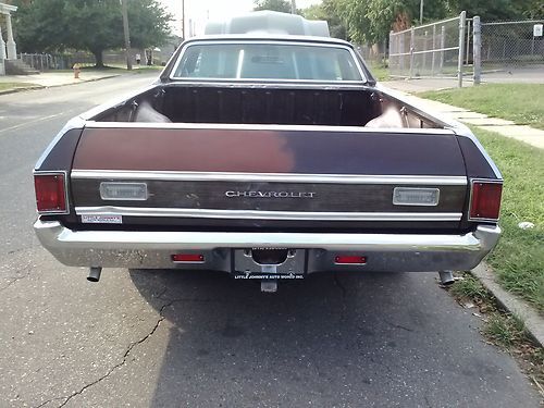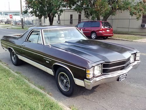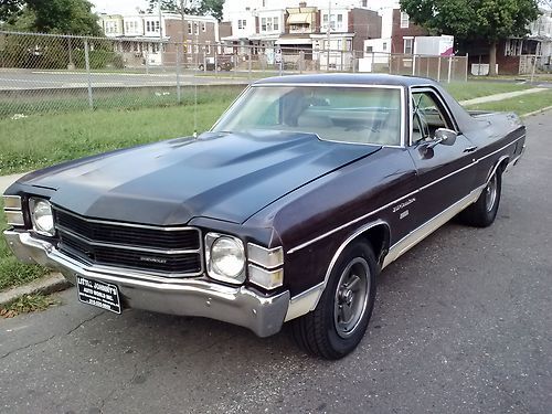 1971 Chevy El Camino, 350, 4 barrel, 4 spd Standard shift, power steering, power disc brakes, A/C, the optional tachometer and gauge package, newer dual exhaust, new heater core, rebuilt original carb, rebuilt upper control arms bushings and ball joints, new front shocks, SS Hood, 12 Bolt Rear. This is a very solid California truck that runs real strong, 100%. I would not hesitate to drive this truck anywhere. Feel Free to come and look and drive before you bid. This vehicle can be sold at any time because it is for sale locally. Please bid with confidence and only if you are a serious buyer. This is a business and it cost money to list this ad. Thank you, and good luck bidding. Any questions or for info please call John @ 215-606-7642.