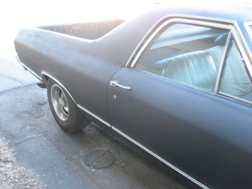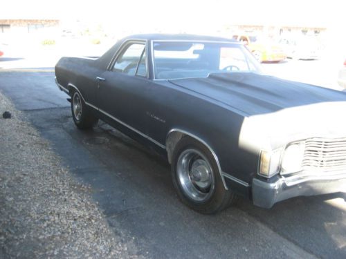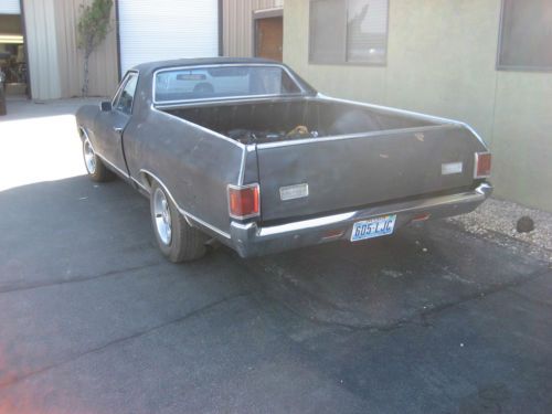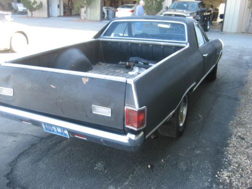 This is a 1972 Chevy ElCamino 454 Motor (LS6) ( Motor was purchased new by last owner 20 years ago). Auto ,Power Steering, Power Brakes, Runs and drives (but the motor has a rattle in it(rod out). It has been Primered and (Needs to be striped and Painted). Has new rally rims and tires. The interior needs to be redone. One small rust spot on lower rear fender about a 3" x 3" spot. floors and bed rust free. The bed is in real good condition . Has a small dent in lleft front fender lower(small) I have to many pojects right now so i am selling at NO RESERVE. If you need to talk to me call me at 775 322-5258
