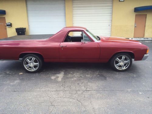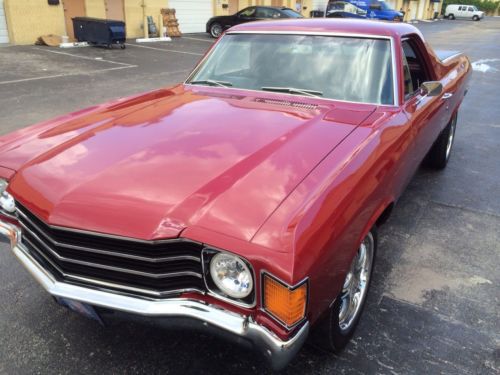1972 Chevy El Camino. The Exterior: New paint, new front fenders and fender wells, doors replaced, new floor in bed, bed is sprayed, new chrome bumpers front & rear, new rubber and stainless trim, after market wheels, new windshield. The car has no rust. It has a nice bed cover. New shocks. Interior: New headliner, new door panels, new carpet, new seats, seat belts, floor counsil, tach, after market steering wheel, new speakers, it has a CD Player. The interior is very nice. It has a 350 V8 and a Turbo 350 automatic transmission. The exact mileage on the drive train is unknown but both are in great shape. The engine starts and runs with no problem and the trans shifts as it should. It has a new carb and intake. Chrome alt, water pump, and valve covers. It has headers and new exhaust. Power steering and power brakes with disc up front. New pads and calipers have been installed. HEI distributor, after market air cleaner. I will not deliver the vehicle but will assist the transporter when picking the car up. This is a very nice vehicle that will give years of great service to the new owner. |