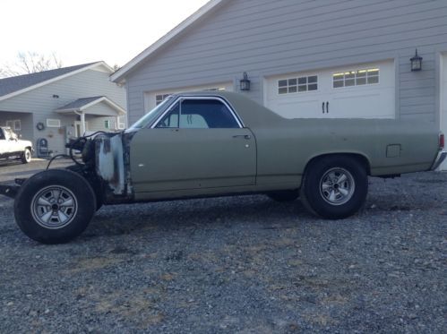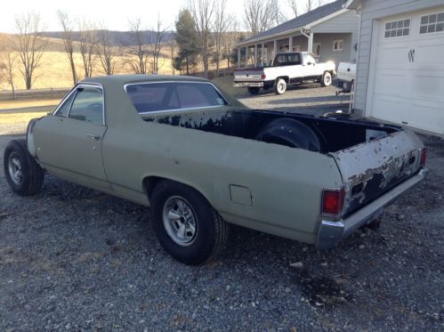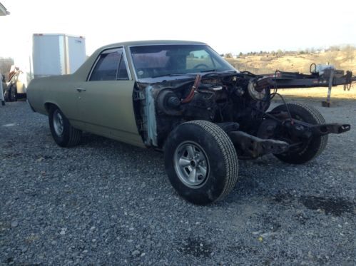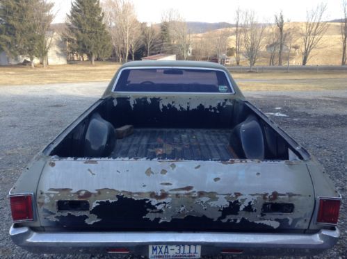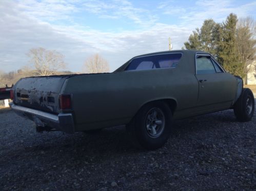 Up for bids is a 1972 Chevrolet El Camino that was an original factory big block car. There is no engine or transmission with this car, body only. This car is very rare and unique because of its factory options and the condition it is in. This car has been in inside storage since around 2002. Before that it was stripped and sprayed with an epoxy or etching primer. It has had both quarter panels replaced at about the same time. Guys you will not believe this cars condition till you see it with your own eyes. Underneath this car is O rust. that's right, no rust. The floors, frame, braces under the bed etc are all very, very solid. Its unbelievable for a car this age to be this rust free. If youre looking for the right car to restore don't miss out on this one. On top of no rust underneath, to make it even more rare and appealing its loaded with options not found everyday on a 1972 El Camino. It has a 12 bolt rear, front power disc brakes, power steering, air conditioning, actual cowl induction hood and a tilt steering column. You don't find all this on one car very often. The front clip was removed when I got the car but most parts are there to put it back as a complete car as it should be. Right off I see missing are as follows, hood hinges, front bumper brackets, one inner fender,and I think theres supposed to be a filler panel that goes between the grille and bumper missing. There may be some trim pieces also missing but I have a lot of it. The doors are very nice except I think theres a very small rust spot on the lower corner of the drivers door, very small, think theres a pic of it. Bottoms of the doors are great as are the door jams and rocker panels. The front fenders are good but I think someone replaced the bottom of one of them, not rusted through but they have replaced it with a new section, its done nicely. The cowl induction hood seems very solid also. I do not have the original induction air cleaner assy but there available aftermarket reasonable. The radiator support is there and appears to be very solid and it has the AC condenser still attached to it. Both bumpers are very, very nice driver quality. Bed floor is solid also. Tailgate looks bad in pic but its just where the paint has come off over time, it is absolutely solid also. Looking inside this car it is is upper driver quality all through although to be nice it needs updated. The head liner has a hole in it from my guess is from a mouse making a new home. The seat needs some attention but its NOT all ripped up, just needs recovered. Same for carpet, ok but needs replaced to be nice. The door panels are very, very nice driver quality, not perfect but nice. The dash pad I think is perfect, don't see that very often on a 72 model. Also the dash has NOT been all butchered up to add accessories as most of them have been done. There is a small gauge panel on the bottom of the dash but easily removed with no damage visible. The tilt column is good and tight and it has a SS wheel on it. Actually the complete interior of this car could be useable with only a good cleaning. Forgot to mention, this car has a pretty nice SS grille with it also. Don't know what else to say about this El Camino so email me with your questions or concerns. If your in the market for a super nice, super solid, original big block El Camino to restore do not miss out on this one. This solid of a car doesn't come along everyday. The buy it now price is more than fair for a car in this condition with the options it has. This is way better than buying a cheap rust bucket and have to replace every panel on it. Check out my positive feedback guys, you don't get great feedback like that if you lie and cheat people, I tell it like it is. I require a $500 deposit at auctions end and the car can sit here awhile as long as its paid for in full. I will work with you or a shipper to get it loaded. This car has a clean clear title. If you have less than 10 positive feedback you must contact me before bidding or I will cancel you bid. PLEASE do not bid if you are not serious about completing the deal should you be the winning bidder. This costs money and time. Also the car is for sale locally so I reserve the right to end the auction early should it sell locally. Look over the pics, ask any questions you may have. If its not in the pics, I don't have it guys. There are pictures of everything so please keep that in mind. Not a lot missing other than what was mentioned in the listing. Thanks for reading my novel and good luck should you decide to bid on this rare, well optioned 1972 El Camino.