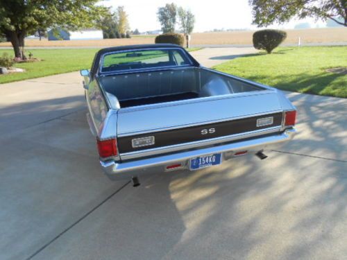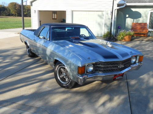1972 CHEVY ELCAMINO SS 454/400 THIS IS A READY NICE ORIGINAL CAR WITH ONLY THE PAINT BEING REDONE 27 YEARS AGO. IT HAS 454 WITH 400 TRANMISSION, AIR, PS, PDB, AM/FM RADIO ,VINLY TOP. THE CAR WAS PAINTED 27 YEARS AGO AND ONLY OUT OF THE GARAGE FOR SMALL TRIPS. IT HAS THE ORIGINAL MAG WHEELS. THIS CAR DRIVES OUT VERY WELL WITH NO ISSUES. FOR MORE INFORMATION CALL 765-860-1532. INSPECTIONS ARE WELCOME. NO TEXTING.