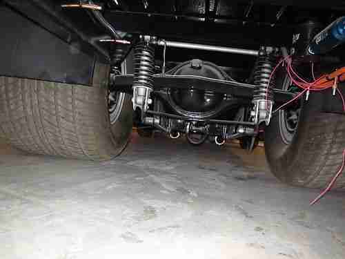 Ladder bar back half with coil over shocks, pan hard bar, 9" Ford rear end narrowed, 430 gears with posi, Moser axle 31 spline, new drum brakes. Weld drag star wheels 15x15 rear, 15x6 front. Hossier tires 33x21.5x15 rear, 205/75-15 front.