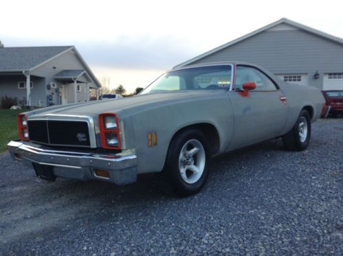 Up for sale is a 1976 Chevrolet Elcamino. This is a running, driving, shifting, stopping car. It has been on the road everyday and has a current WV state inspection sticker. You can buy this, drive it everyday and fix it up to what ever extent you want as time and cash is available. I owner this car about about 4 or 5 years ago and did some body work on it and its just now starting to show some minor places where its coming through so that tells you it wasn't serious if it took that long for it to resurface. It does have a few new spots that will need some attention soon but overall its pretty good. The doors are fairly solid inside but the pics show some repair on the inside of them, nothing major. Inside the bed is very solid with only one dent worth mentioning. The bumpers are everyday driver quality, not real nice but useable. The front one has a slight twist on one corner but it can be straightened, think theres a pic of it. The chrome is fair on it. The body shows some orange paint under some parts etc, think it was kind of being cut in for a complete orange paint job. The passenger front floorpan is bad and the others are soft but still there intact, RF is the only one needing repaired soon as it has large holes in it. The frame is good. The interior has a very nice bench seat, door panels are driver quality, passenger side is better than drivers. Dash pad has a hard cover on it which fits great. The carpet is worn and faded but all there. There is a Sony CD player and some aftermarket gauges also. The windows are manual but it has power locks. All the lights work but for some reason the heater does not blow, not sure why. This is a AC car but someone removes the compressor and lines from under the hood. Don't think any lines were cut. The engine in this Elcamino is a 350 and a 350 turbo trans. The engine runs great with no noise whatsoever and the trans shifts great. The wheels are pretty sharp and look great on this car, they are in great condition. The front tires have some small dry rotting cracks on the side wall but they have decent tread. They have been on the road so guess they are ok to run awhile yet. The rears aren't to good and will have to be replaced soon. The car also has dual exhaust with what sounds like glass pack mufflers on it, has a good sound for glass packs. That's all I know to tell you about this great Elcamino so email your questions about anything I may have missed. Remember guys this car has been on the road lately and the inspection is up to date. This car needs a little TLC to be real nice but its good the way it is. You can completely go through it or just drive it as it is. Its not everyday you find a Elcamino that you can get in and drive down the road for this price so don't miss out. Thanks for reading my novel and good luck should you decide to bid on this great Elcamino. Checkout my feedback guys as its well over 500 and all positive so rest assure your dealing with an honest ebayer. You don't get great feedback like that if you lie and cheat people, I tell it like it is. Also delivery is possible on this Elcamino depending on your location. It can stay here awhile while waiting to be picked up or shipped as long as its paid for according to the auction. I reserve the right to end the auction early as its advertised for sale locally also. If you have less than 10 positive feedback you must contact me before bidding to assure me you will follow through with the transaction shoud you be the winning bidder. Thanks and good luck!!!!