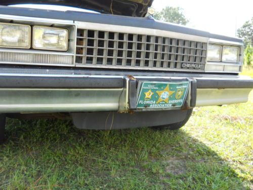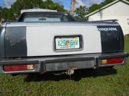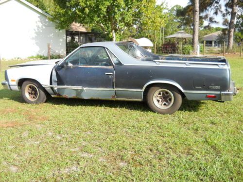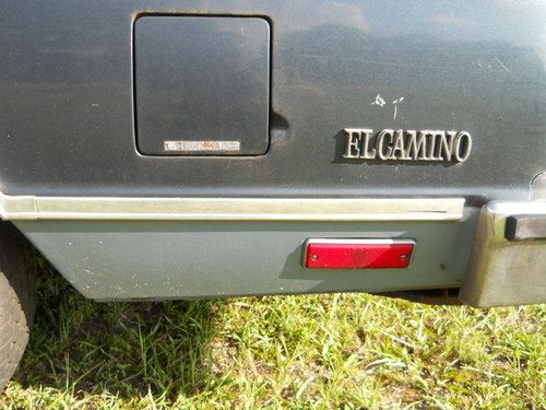 THIS IS A 1987 CHEVY EL CAMINO LAST YEAR PRODUCED. IT WAS ACQUIRED FROM THE ORIGINAL OWNER WHO PURCHASED IT IN 1986 AND IS FOR SALE. I RESERVE THE RIGHT TO END THIS AUCTION EARLY IF THE VEHICLE IS SOLD LOCALLY. IT IS VERY SOUND RUNNING CONDITION BUT IS SLIGHTLY BURNING SOME OIL ESPECIALLY WHEN IT SITS FOR FEW WEEKS. AS YOU CAN SEE BY THE PICS IT IS IN NEED OF PAINT AND SOME RESTORATION. THE MAJOR PROBLEMS ARE DRIVER SIDE DOOR WAS SEVERELY DAMAGED WHEN THE OWNER BACKED OUT OF HIS DRIVEWAY AND CAUGHT A CURB, FORTUNATELY THE DOOR WAS WEEK FROM ROTTING AND NO MAJOR DAMAGE WAS DONE AT THE POINT OF THE DOOR HINGES SO I BELIEVE A NEW DOOR COULD BE BOLTED RIGHT UP. THE OLD DOOR WINDOW MECHANISM IS STILL WORKING JUST AS EVERYTHING ELSE ON THIS VEHICLE EXCEPT FOR THE AIR CONDITIONING. THE MAIN AREAS ON THE BODY TO BE CONCERNED ARE THE THREE SPOTS AROUND THE REAR WINDOW THAT ARE ROTTING, THE BUMPER GUARDS ON FRONT AND BACK BUMPERS ARE NOT SALVAGEABLE AND ARE ROTTING BUT THERE IS NO PROBLEMS WITH THE BUMPERS THEMSELVES, THE FRONT HOOD ON THE FORWARD EDGED IS ALSO GOT SOME ROTTING BUT I DO HAVE A SPARE HOOD THAT IS IN MUCH BETTER SHAPE THAT WOULDN'T NEED AS MUCH WORK, ALSO THE CROSS PIECE UNDER THE HOOD THAT THE RADIATOR IS AGAINST HAS ITS SHARE OF ROTTING BUT IS INTACT AND IS POSSIBLY SALVAGEABLE. THERE IS NO OTHER AREAS OF ROTTING ON THE BODY. I TRIED TO TAKE PICTURES TO BEST DESCRIBE EVERYTHING. THE GLASS AND INTERIOR ARE DECENT NO HOLES OR SIGNIFICANT DAMAGE. THERE IS A SINGLE CRACK ON THE TOP OF THE DASH AND THE DRIVER FLOOR BOARD IS BOWED DOWN LIKE THERE IS FLOOR BOARD PROBLEM BUT I WILL UPDATE THIS LISTING AS I HAVEN'T PULLED THE CARPET BACK TO SURVEY WHAT IS WRONG WITH IT. I HAVE CHECKED OUT THE UNDERCARRIAGE AND THERE IS NO SIGNS OF SIGNIFICANT PROBLEMS. I'M NOT SURE BUT WHEN I WAS DRIVING IT, IT DIDN'T BURN OIL BUT THERE IS SOME SLIGHT BLUE SMOKE COMING OUT OF EXHAUST WHEN I START IT BUT DOES DISAPPEAR AFTER IT RUNS A BIT, ABOUT EVERY OTHER WEEK TO KEEP THE BATTERY CHARGED. I HAVE A STACK OF RECEIPTS FROM THIS CAR. IT IS BEING SOLD AS IS WITH NO WARRANTY AND NO RETURN SO BE SURE OF WHAT YOU ARE BIDDING, TITLE IS IN HAND AND FREE AND CLEAR. I WILL ANSWER ANY QUESTIONS AND POST THEM FOR ALL TO SEE. I WILL ONLY ACCEPT A DEPOSIT OF $500.00 THRU PAY PAL. THE BALANCE DUE WILL COME IN THE FORM OF A BANK CHECK, CASH OR MONEY ORDER UPON PICKUP OR OTHER ARRANGEMENT MADE BETWEEN THE BUYER AND ME. IF BALANCE IS PAID BY PAY PAL IT WILL NEGATE AND CANCEL THE TRANSACTION. THE BUYER IS TOTALLY RESPONSIBLE FOR ANY FEES TO PICKUP AND SHIP THIS VEHICLE TO ITS DESTINATION. I WILL ASSIST IN A WAY THAT IS NOT GOING TO COST ME ANY FUNDS. I DO HAVE A FRIEND WITH A LONG DISTANCE VEHICLE SHIPPING COMPANY IF THE BUYER IS INTERESTED. THANKS AND GOOD LUCK. YOU CAN CALL ME AT 321-525-2533 LEAVE A MESSAGE AND I WILL RETURN ALL CALLS. JEFF