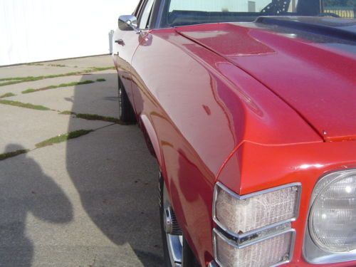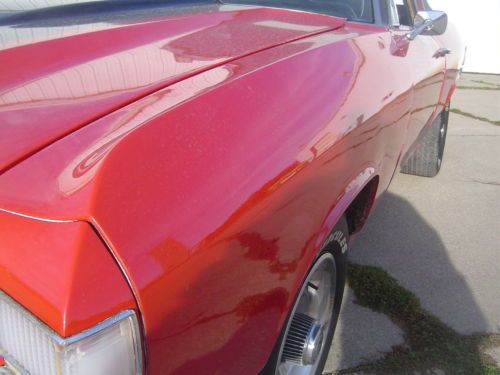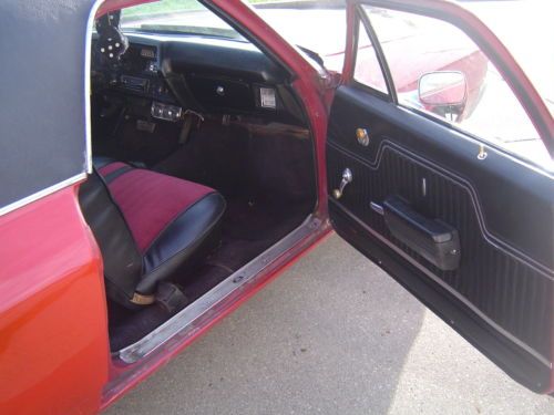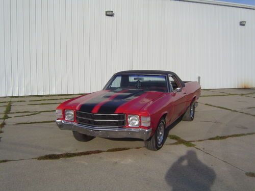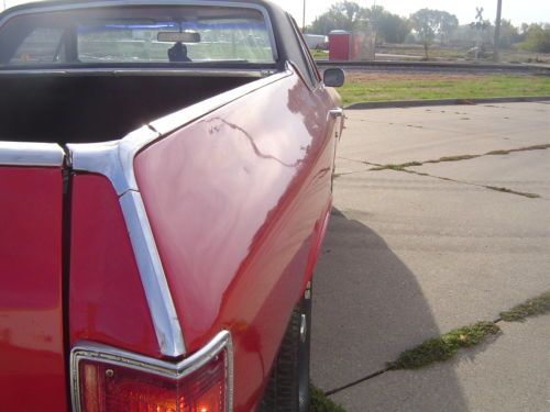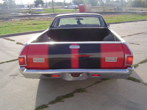 1971 GMC Sprint / El Camino. This car is titled as a GMC Sprint but has had the badging changed to Chevrolet El Camino. If you are looking for a good running and driving El Camino that's ready to go, this may be your car. The 350 engine fires right up and runs great. The engine has had a chrome accessory kit added that really looks sharp! The automatic transmission shifts smooth like it should. The car has had good Flowmaster dual exhaust installed that sounds awesome. The interior in this vehicle is also in good shape. There has been an after-market radio/CD player installed. The cloth seat is in nice shape, carpet is all good, the dash has a crack on the passenger side; other than that it is in nice shape. The body is all there and in good shape considering the year. There is a little filler behind the wheels down low, and the hood hinges could use some adjustment. The doors and windows all open and close like they should. The paint job is newer and the red really looks great with the black vinyl top and the SS stripes. The car has good tires on factory Rally wheels that all look good. Overall this car is in very good shape considering it is over 40 years old. With that said, it is not a show car....but it is a great driver that is very nice looking and turns heads everywhere you go.