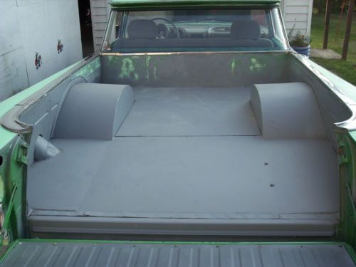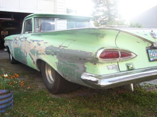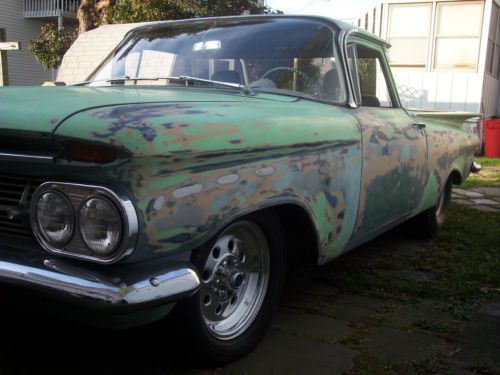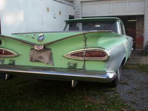 up for bid is a 1959 el camino.396 bored out .30 over with approximately 9 thousand miles on motor,t-10 4 speed,new clutch kit,rebuilt front end,upper & lower ball joints,control arm bushings etc.new big block radiator,carpet,headers,and disc brake set-up in front.speedometer and gas gauge work wipers work but needs a new switch.back halfed 9 inch ford rear ladder bar set-up with 31/18.8 mickey thompsons.new door seals but not installed.passenger side front coil spring is weak and should be replaced.comes with some extra parts.buyer is responsible for vehicle pickup or shipping.500.00 non-refundable deposit through paypal is due within 24 hours of auction and full payment within 7 days.vehicle is being sold as-is with no warranty.i reserve the right to cancel this auction at any time and for any reason.0 feedbacks will be ignored or cancelled due to past experience with these deadbeats.