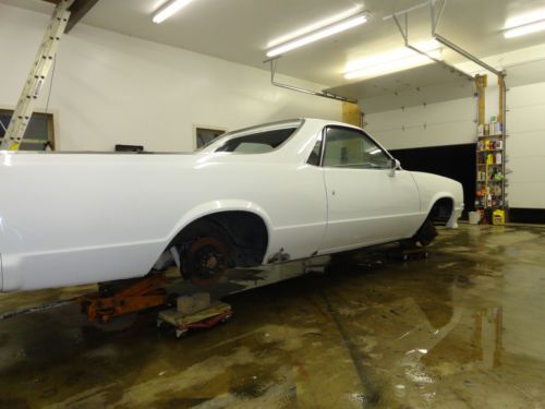 I have owned this Elcamino since 1998 but haven't driven it since 2008. Needs body work and repainted. It has a 95 LT1 engine and 4L60E automatic transmission out of a Trans Am in it and has 19,000 miles on it. Moser 9 inch Ford rear end with 31 spline axels. Wilwood disc brakes in the back and 12.5 chevy station wagon brakes and spindles on the front with Hotchkis tubular upper A-arms. Engine is cooled by a big Griffin aluminum radiator and top of the line Spal dual fans. Trans it shifted by a B&M hammer shifter.Gages by Auto Meter. Music by Alpine. As you can see this Elcamino has some nice features on it. Custom head lights,front air dam, fiber glass bumper and shaved door handles. Since I have lost interest in this project I don't want to put any money in it so you will need to supply wheels and tires at time of pick up. This will be a great starter project and you wont have to lay out a lot of cash to get on the road.