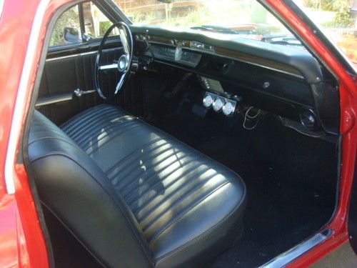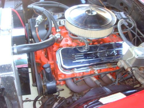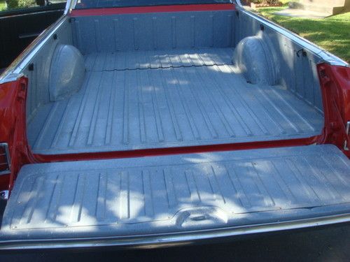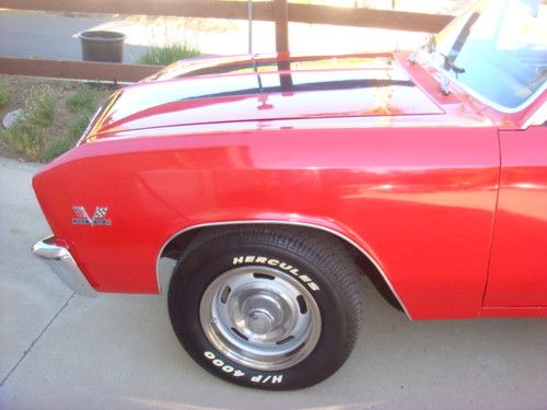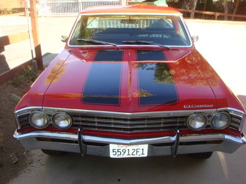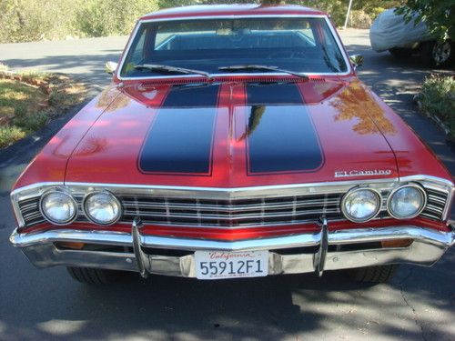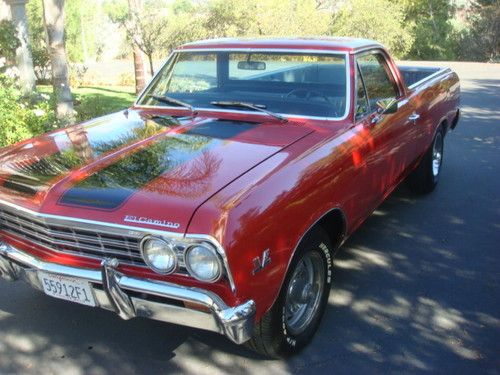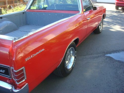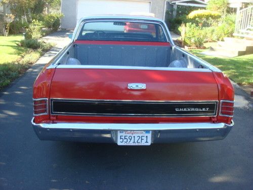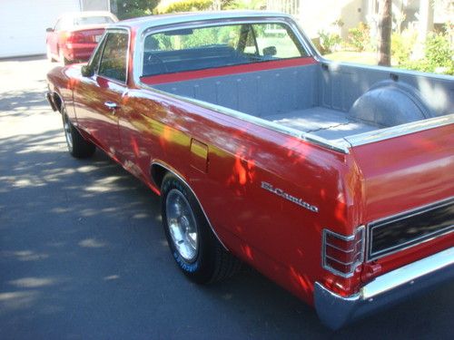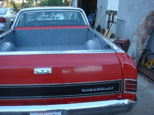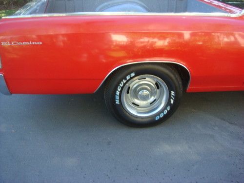 I have owned this El Camino for about 15 years and i started to restore it about 5 years ago. The frame has been cleaned and painted semi. flat back. Wheels have been removed and parts replaced as needed. The motor is a freshly rebuilt 396 with a 400 turbo trans. The cars is equipped for air conditioning, lots of missing parts. The paint is about 8 months old, red with black stripes, it is not an SS I just like the look with the stripes. New interior, new headliner, carpet, door sills, door panels and reupholstered seats. Doors have new rubber kits, has rally wheels, 8' in the back and 7' in the front, new tires. The bed is coated with zilatone. Most of the stainless is original and in good condition. It is missing bottom stainless rear window. The car is equipped with dual exhaust, has headers with 2 1/2 pipes and turbo mufflers. The pipes exit just behind the rear wheels. Front and back bumpers have been re-chromed. The front bumper has bumper guards (rare). I have the original radio. This El Camino has a mild cam. This car is not a hot rod. A very nice daily driver and does turn heads. For more information call Henry 1(951) 640-4100