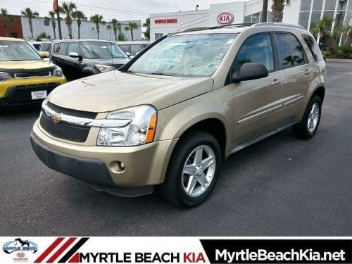Look at this 2005 Chevrolet Equinox LT. This Equinox comes equipped with these options: Brakes, front disc/rear drum, Steering column, tilt, Daytime running lamps, Cruise control, electronic with set and resume speed, Daytime running lamps, Defogger, rear-window, electric, Fog lamps, front, halogen, All wheel drive, Moldings, bodyside, body-color, LATCH system, (Lower Anchors and Top tethers for CHildren) for child safety seats. It has an Automatic transmission and a Gas V6 3.4L/204 engine. See it for yourself at Myrtle Beach Kia, 4811 HWY 501 , Myrtle Beach, SC 29577.