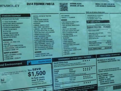Air conditioning, manual climate control,Armrest, rear center with dual cup holders,Assist handles, front passenger and rear outboards,Compass display included in Driver Information Center (DIC) (Not available with (UE0) OnStar delete.),Console, front center with armrest and concealed storage,Cruise control, electronic with set and resume speed,Cupholders, 2 front in center console and 2 rear in center armrest with 1 bottle holder in each door,Defogger, rear-window electric,Door locks, power programmable with power lockout protection,Driver Information Center monitors 26 various systems including, Vehicle Information Menu (oil life, tire pressure, standard/metric units), Trip Information Menu (trip 1, trip 2, fuel range, average fuel economy, instant fuel economy, average vehicle speed) and compass display,Floor mats, carpeted front (Standard on orders entered or re-edited as of 11-20-13. Optional on orders entered or re-edited before 11-20-13. May be deleted for credit by adding (R6Q) floor mats not desired on Fleet or Government orders only.), carpeted rear (Standard on orders entered or re-edited as of 11-20-13. Optional on orders entered or re-edited before 11-20-13. May be deleted for credit by adding (R6Q) floor mats not desired on Fleet or Government orders only.),Instrumentation includes speedometer, single trip odometer, fuel level, engine temperature and tachometer,Lighting, interior with theatre dimming, center-mounted dome, rear cargo area, dual front map lights, ambient lighting on center stack surround, and center console cupholders,LS Interior, Base Cloth,Map pocket, front seatback, driver and front passenger,Mirror, inside rearview manual day/night,Power outlets, 4 auxiliary with covers, 12-volt includes 1 front of console, 1 in console, 1 in back of console and 1 in cargo area.,Remote Keyless Entry with 2 transmitters, panic button, content theft alarm activation verification and illuminated entry,Seat adjuster front drive A minute at Dimmitt could save you thousands. Everybody's Approved !
