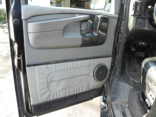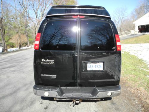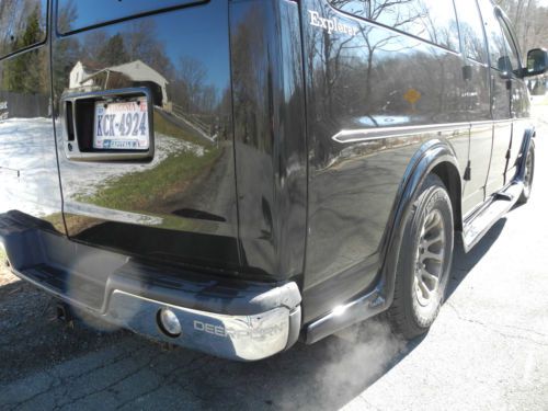 premium chrome wheels, backup camera, and more! Conversion: Explorer Chassis: Chevrolet Express 1500 Engine: 5.3L V8, 301 Horsepower, 4-Speed Automatic Transmission, All Wheel Drive Exterior: Onyx Black Paint, Running Boards, Chrome Bumpers, High-Top Raised Roof Interior: Black Color Decor, Wood Grain Accents, Premium Leather Seating For 7 Passengers, Day/Night Window Shades Climate Control: Front and Rear A/C & Heat. Dual Climate With Rear Controls Center Console: Yes, With Cooler Front Seating: Premium Leather Captain Chairs, Dual 6-Way Power Front Entertainment: