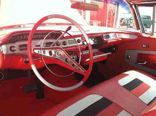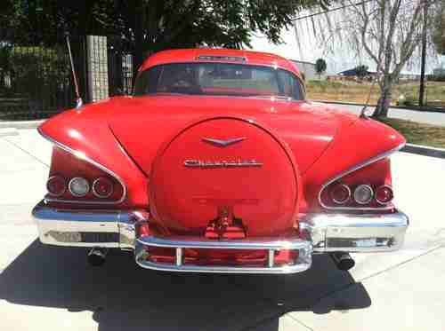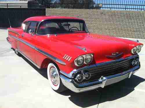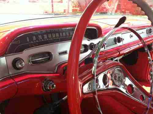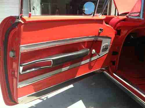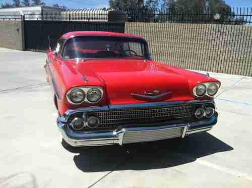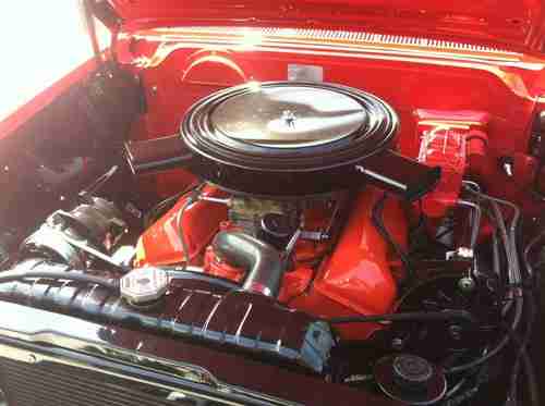 This Impala went through complete frame off restoration, with new floor pans and trunk pan. Installed interior with heat and sound barrier insulation on floor, roof, and doors. Body was stripped to metal and painted back with 4 coats of clear coat. Engine has been completely rebuilt and has been driven 0 miles since restoration. It has a remote trans cooler with its own electric fan, a 140 amp alternator, power steering and hydro boost master cylinder for power brakes, also front disc brakes, has power windows and Vintage Air conditioning. Interior is Impala reproduction Red, Silver, and Black. All stainless chrome has been redone. Chrome is triple plated.