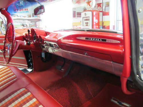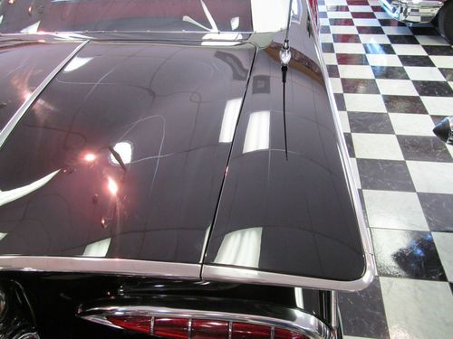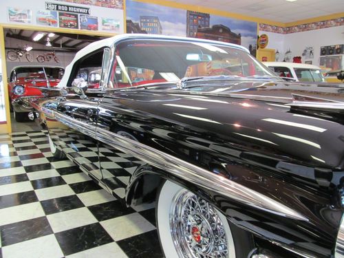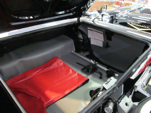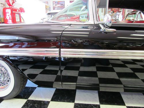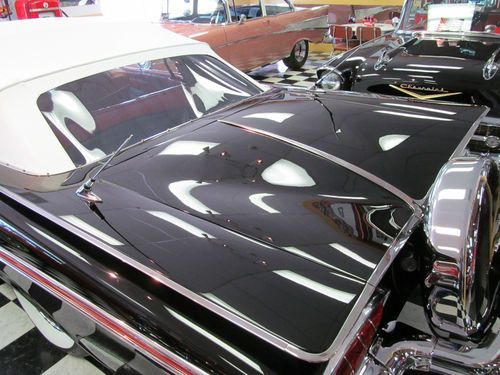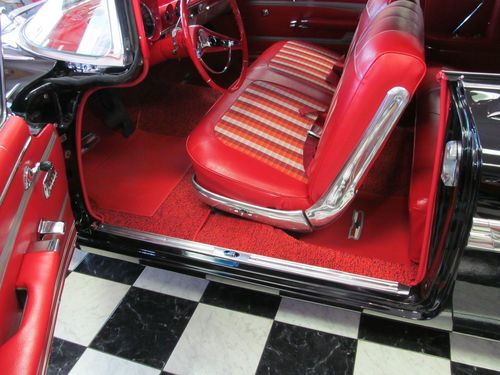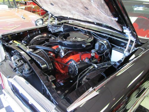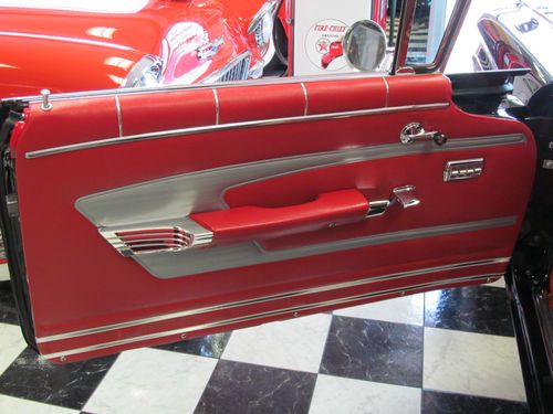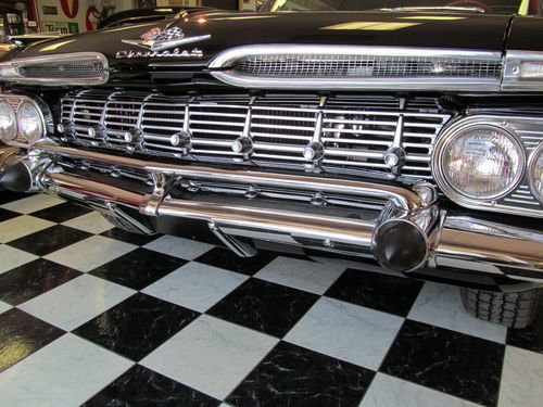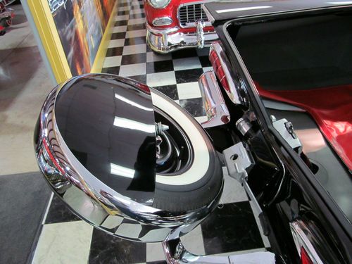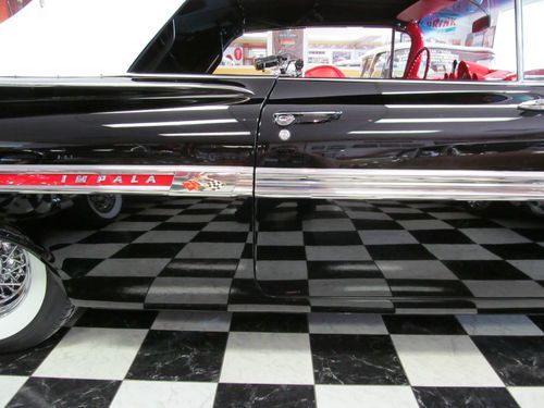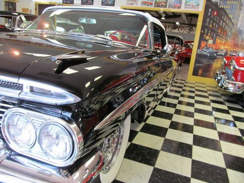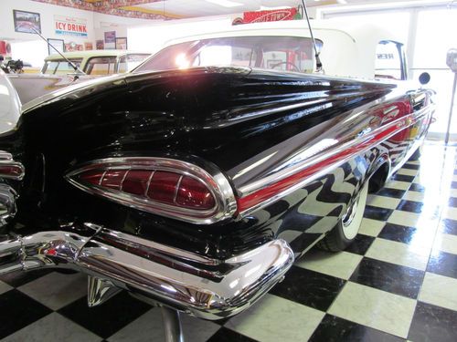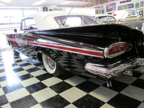 This is a fabulous matching numbers '59 Convertible. A professional, frame off, rotisserie restoration has just been completed on this car. The body was in excellent original condition and is solid and laser straight. This was a nut and bolt restoration. Every detail was attended to. This car is knee deep in Tuxedo black base coat, clear coat paint with a mirror finish. The white top fits to perfection and the Reo Red, original style interior completes the great look of the car. It has a 348 tri-power V8 engine with an automatic powerglide transmission. The many factory options on this car include power steering, power brakes, power seat, power windows, continental kit, fender skirts, power top, bumper guards, windshield washer, deluxe push button radio, dual rear antennas, dual rear speakers and factory tinted windows. The car is shown with new wire wheels and wide whites. The original wheels and hub caps go with the car. If you are seriously looking for a '59 Chevy Convertible you won't find a nicer example.