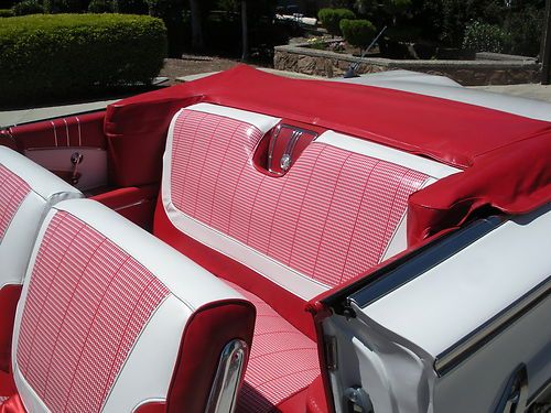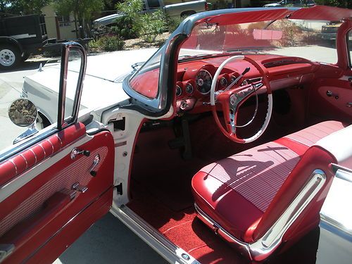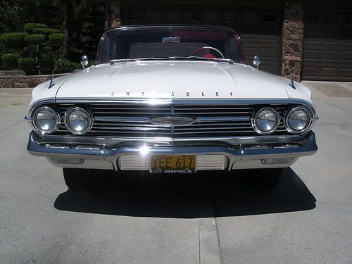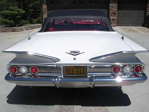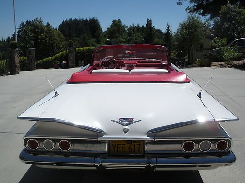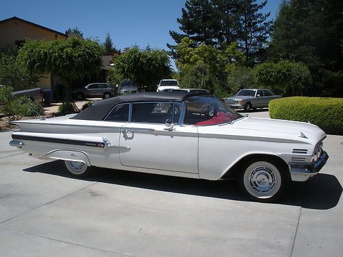 Described here is a 1960 Chevrolet Impala Convertible, 283 V-8 engine with 4-BBL Carb and dual exhaust. This car was purchase in North Carolina in 2009 and registered in California in April 2011. The car had been stored outside for a period of time prior to being aquired by the owner I purchase the car from, he had stored the car in his garage for a period of time. The car had some rust and frame on restoration was started shortly after I received the car. The floor pans were all replaced including the ones under the rear seat, the trunk floor was also replaced. Repair work was also done on the rocker panels including replacing the other skins and repairing the rails underside, lower quarter panel work was also done. Additional, repair work was done to the rear section of the car which had some collision damage. The frame was cleaned and painted while the floor pans were removed. The car was repainted with original white Acrylic Lacquer paint, paint code GM 936, (Artic White). The interior dash and other metal parts were painted in red as the original. The 283 V8 engine was completely rebuilt and the 2-Speed Powerglide transmission was rebuilt as well, a new seal was installed in the standard rear end. This is a matching numbers car to my knowledge. Dual exhaust was installed although not on the car originally from the factory. This is the only major modification that was done to the car, other than that, the car is completely standard, no other modifications at all. The entire interior was replaced with red/white houndstooth design sold as a kit. Door side and vent window glass were replaced while the windshield and quarter window glass were cleaned and retained. Door, trunk and convertible top seals were replaced and a new black top was installed. The push button radio works well, but I was not able to hook up the rear seat back speaker. The car was registered for the first time in California in April, 2011. I estimate that the car has been driven less than 2k miles since restoration work was completed at that time. The DMV registration records from North Carolina show that the car has had only one registered owner before, this owner had the car registered for about ten years starting from the time the car was purchased new in 1959, accordingly, I am the second registered owner. The car rides very well and has plenty of power, it looks beautiful and driving it on the road turns many heads and I receive many thumbs up. On parking lots people stop and ask questions, many from the older generation say that they, a friend or a family member, used to own one of these, I ask where is it now? and why did you get rid of it?, there is usually no answer. The reason I am selling this car is that I am running out of space on my property. I have bought several other cars like it that I restore as a hobby, so something has to go. Please let me know if you have any questions about the car, I will be sure to get back to you as soon as possible.