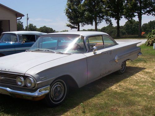 1960 IMPALA 2 DR. HT. BUBBLE TOP 283 RUNS GOOD POWERSTEERING PB. POWER GLIDE TRANSMISSION BRAKE BOOSTER NEEDS WORK. NEW EXHAUST NEW BRAKE SHOES AND CYLINDERS NEW SEAT COVERS AND CARPET BUT NEEDS DOOR PANELS AND HEAD LINER VERY LITTLE RUST IT IS IN PRIMER BUT WAS WHITE WITH BROWN INTERIOR.