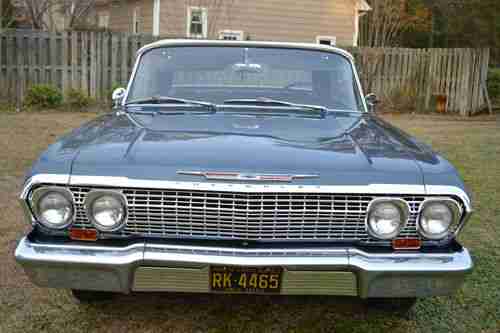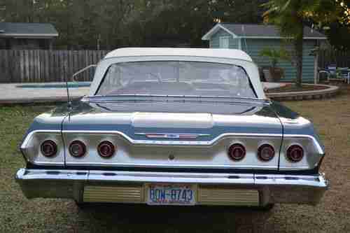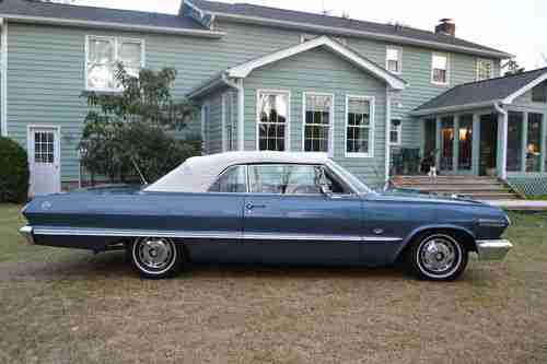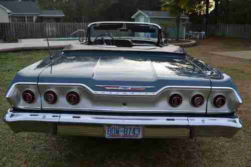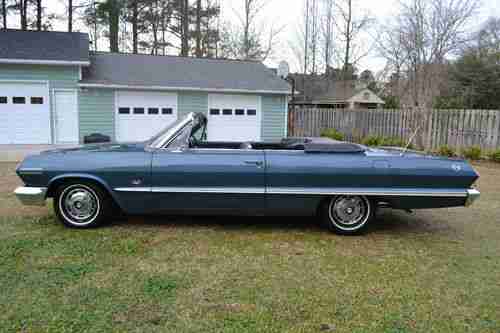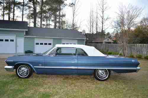 1963 Chevrolet Impala S.S. Convertible, 327/300 hp, 4 speed, posi-traction rear. Restoration was completed in 2006 and car has been enjoyed at local car shows and driven on car cruises ever since, adding about 2000 trouble-free miles after restoration. Runs and drives great! All original sheet metal and floors. Monaco Blue Poly paint with white convertible top and new black interior. Has power steering, power brakes, and tilt wheel. Everything works correctly except the radio. This is a strong # 2 car and it's hard to find one in this condition. Car is advertised locally and I reserve the right to drop this ad at any time. Any questions call Butch @ 1-910-232-5794