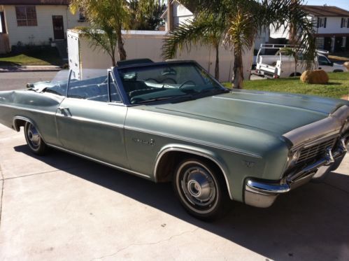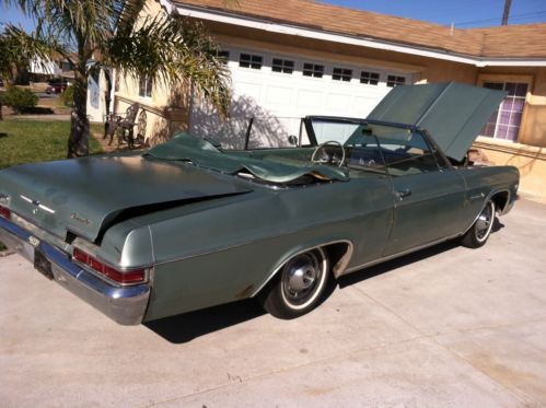 1966 CHEVROLET IMPALA CONVERTIBLE. ONE OWNER WITH 69 K ORIGINAL MILES. NOTHING HAS EVER BEEN CHANGED . INTERIOR IS ALL THERE WITH PERFECT DASH BOARD AND ONE OF THE MOST ORIGINAL CARS YOU WILL EVER FIND. WHEN I SAY THIS A BARN FIND I AM SERIOUS. WHAT YOU SEE IS WHAT YOU GET. ONLY A LITTLE RUST ON IT , ALL NUMBERS MATCHING 283 MOTOR WITH POWERGLIDE TRANSMISSION IF YOU ARE LOOKING FOR ONE ORIGINAL 1966 IMPALA CONVERTIBLE THIS IS IT. BRAND NEW WHITE TOP.