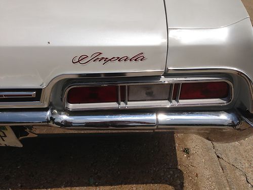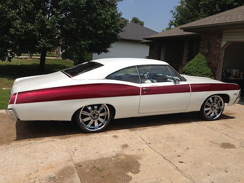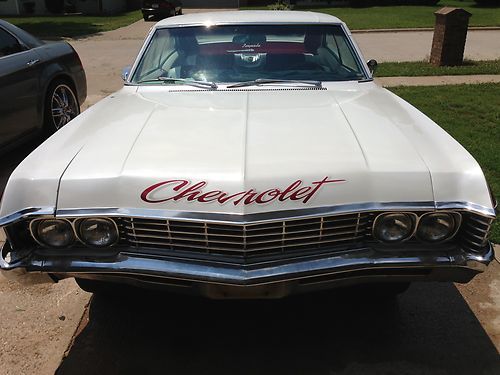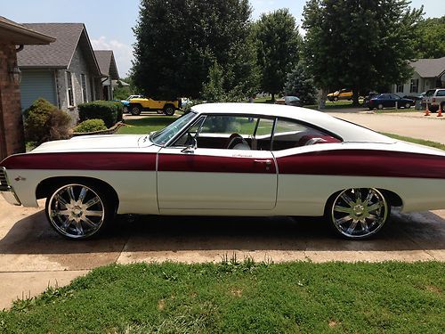 Up for auction is a 1967 Impala. The car has a chromed out 327 motor with a mild cam that was completly rebuilt under 100 miles ago. It is set up with a full msd igniton with billet distributor. Car is equipped with headers in front of a brand new Magna flow exhaust that really sounds good. It sits on 22" chrome wheels. The entire front end and rear end have been rebuilt. It has brand new custom interior with "Impala" and "67" embroided on the door panels and under back window and also on floor mats. This beautiful Impala has airbrushing on each door and trunk lid that reads "Impala". "Chevrolet" is airbrushed on the front hood and the impala logo is airbrushed on each fender. I almost forgot that the guage cluster has been airbrushed as well. Please go through all the pics so you can see all the time that was spent on this car. I will try to name all the stuff that is new on this car but it is rather hard because its almost everything. Here's whats new...all the outside chrome trim, both tail lights, front windshield, both interior and exterior door handles, all window cranks, all floor pedals, both door and trunk locks, all gas lines, brake lines and tranny lines, radiator, water pump, alternator, intake, valve covers, air filter, msd ignition, I'm sure theres much more but you get the idea. what the car needs to be finished is the bumpers to be rechromed, a dash pad, the arm rest to be upholstered the correct color, steering wheel to be correct color, there may be a few things that I've forgotten, but as you can see, these are not major issues. The car does have a few imperfections in the paint but overall a great car for the money. It is also prewired with "0" guage wire and all the rca's and speaker wire you would need to put a high end audio system in it if you choose to do so. That reminds me that every inch of the floor board and roof is covered in dyan mat.This helps with road noise, insulation, rattling, you name it. Bid confidently on this true one of a kind car. All questions will be answered quickly. A $500 deposit is required within 24 hours from end of auction. The remainder will only be accepted through paypal or certified check and must be recieved within 7 days from end of auction. The car is sold as is and is located in Springfield, Mo. Feel free to come see the car before bidding. I will help with shipment of the car to anywhere in the US once car has been paid in full.