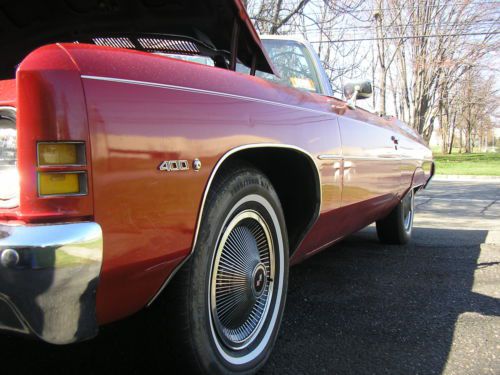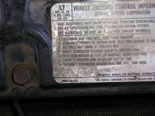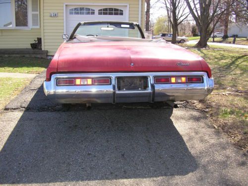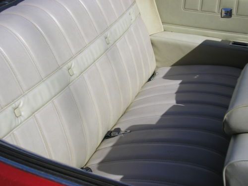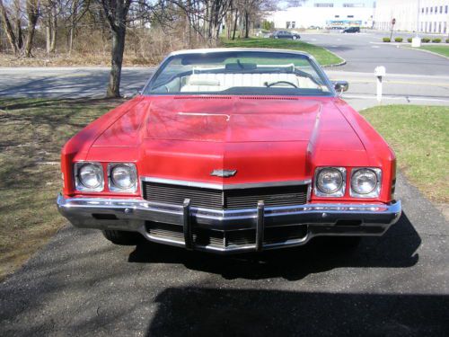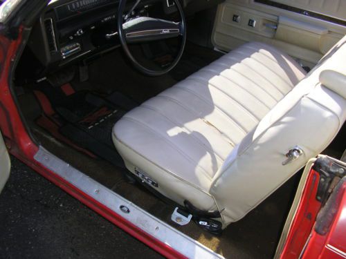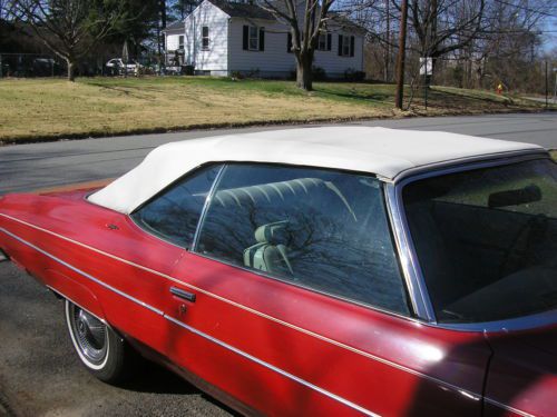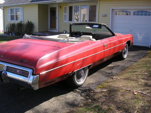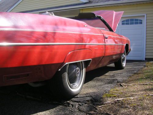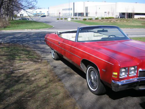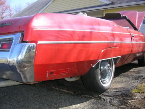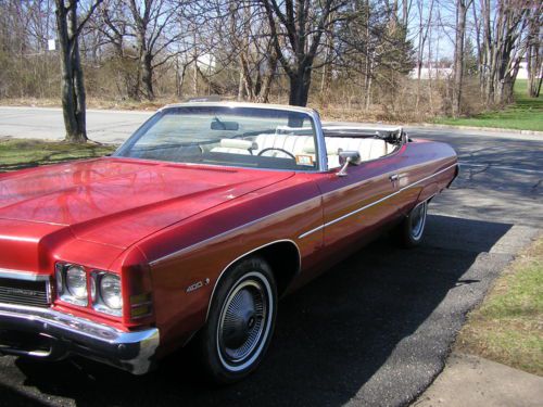 Here we have a very rare 1972 Chevrolet Impala Convertible. In1972 Chevrolet only made 6456 Impala convertibles which is low enough, but this convertible has the supper rare 402 big block engine. This was such a low production car, that they didn't even make big block 402 emblems for the fenders, they used the small block 400 emblems. On the shroud of the car you can clearly read 402 engine (see picture). This is a very solid car that features the 402 big block with a 4 barrel carburetor backed up by the famous 400 short tail transmission and factory duel exhaust. The Engine runs very strong with no knocks taps or smoke, and the transmission shifts well. the front end seems tight and the brakes stop well, but the pedal is a little hard. This car also features power windows , door lock, and seats, Air condition and they all work well but air needs a charge. This car has a new top with a glass window and it goes up and down with no problems and the boot is in the trunk.. The body on this car is very solid with no rust in the floors ,trunk. or frame and has the rare factory skirts. all the panel seem to be very solid with some light bondo on the quarters . This car was originally Blue and now has a red repaint that is in fair but presentable condition. The interior is in very nice condition with just a split in the drivers seat. Chrome and bumpers are straight but could use re-plating for the show car. This car is 100% original except for the radio and would be a great car to restore or just put the top down and drive. Inspection is available by appointment. Please feel free to email with any questions |