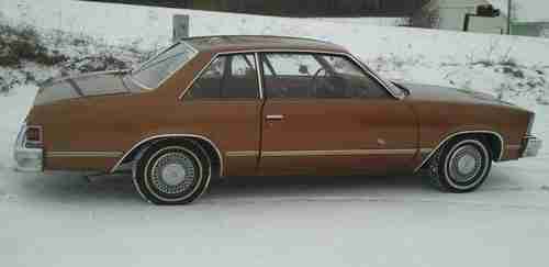 I am selling my 1979 Chevrolet Malibu with 18,696 original miles on it and is in great condition! This car has been garage kept, well maintained, and adult driven its entire life. This car has very few options on it with manual windows and locks and only an AM radio. This car runs and drives great and needs nothing. The exterior is a brown in color and is in good condition. It has some very minor rust forming near the rear quarter by the wheels but is hardly noticable. The grill has a couple small cracks on it and some dings in the chrome trim around the passenger side door. The interior is also brown and is in good condition. Everything works the way it should including the heat. Some of the plastic peices in the rear seat are a little scratched up but not too bad. The engine bay is clean with a lot of the original blue paint still there. There is a little bit of the paint chipping off of the aluminum intake but most of the paint is still there. The engine runs very smooth and the transmission shifts perfectly. If you have any questions that I did not answer in the description feel free to send me a message.