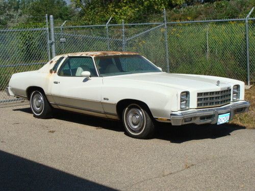1977 Monte Carlo Landau 350 CI Four barrel carb, AC, Power windows, power brakes, Swivel bucket seats, center counsel. White interior and exterior. came to Minnesota from California 2 years ago. has never been driven in salt or snow. there is absolutely no rust to the underside. car is very straight and has the original paint. has never been repainted. car needs vinyl top and some upholstery work to the carpet, seats, headiner and dash car runs a little ruff at idle but goes down the road good and stops good. car is available to be inspected during normal business hours. vehicle sold "As is where is" any questions please e-mail or call Steve at 763-478-8500