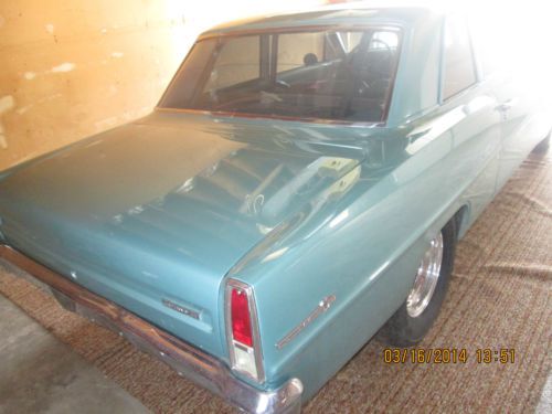 Beautiful professionally built Pro street 66 Nova sedan.Super fast Very fresh and new. Garaged entire life and very straight body. Appears stock except for wheels and tires. This car cost over 40 K to build without labor so no unrealistic bids please. Priced with reasonable reserve,but will not be given away No insults please. 468 inch big bock Chevrolet 600 HP. Radical but not too radical to drive. Very fast. Street tor strip. Independent suspension with manual rack and pinion and Flaming River column, Polished aluminum fender wells. 3 inch ceramic coated headers. 9 inch Ford with 4;11 Posi and Moser axles and gears. 8 point NHRA roll cage with Simpson harnesses passenger and driver. MT drag radial brand new in mini-tubs.Mallory ignition and carbon fiber wiring. Bendix electric fuel pump. Aluminum radiator New Weld wheels. No expense was spared on this professionally built Nova. interior and dash are stock. Has nice rake with adjustable completion shocks front and back. drives nice and tracks straight. This car attracts crowds any time driven. Sounds awesome like a big block should. Idles rough at about 1200 RPM. Drive anywhere. Good luck bidding. For questions 501-517-6833.