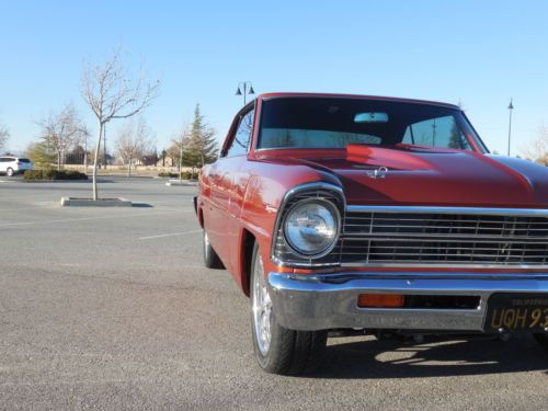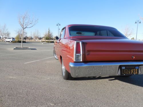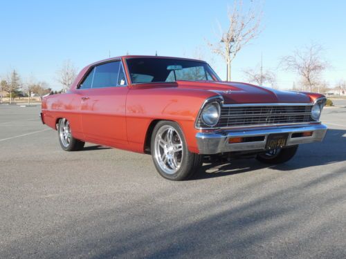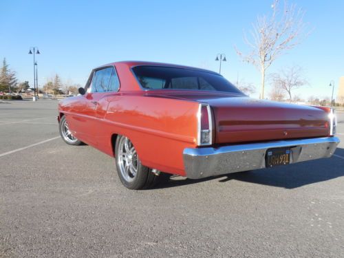 Chevy II Nova Interior: Billet specialties Fast lane wheel Ididit steering column (chrome) Dakota Digital Dash Kenwood in dash stereo Camaro Front bucket seats custom covered Custom center console Exterior: Sunburst orange metallic II paint Tinted windows, side glass the glass is tinted not film Trim you see in the pictures has been polished Steele cowl hood that has been fitted real nice. Front suspension and brakes: Heidt’s front clip Lower A arms replaced with TCI lower arms Shocks replaced with TCI coil over kit 500lb springs Swaybar upgraded to a TCI 1” bar Heidt’s disc brakes all lines replaced Rear suspension and brakes: Multi leaf springs 2”