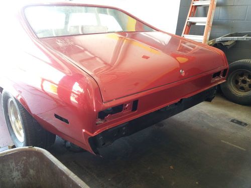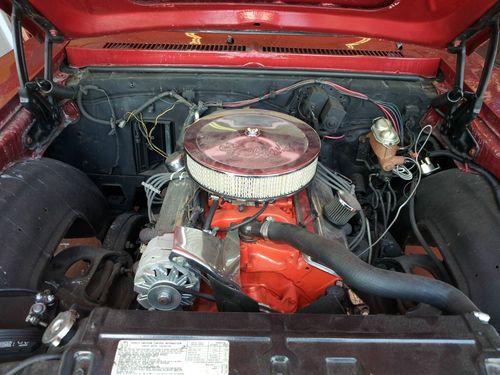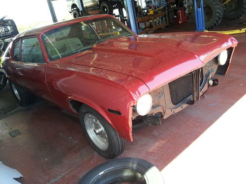 1973 CHEVY NOVA TWO DOOR SUPER CLEAN BODY RED, NO RUST 4" COWL HOOD TRUNK SUPER CLEAN. 350 ENGINE AND TRANSMISSION, BRAND NEW TIRES, BRAND NEW GAS TANKS BRAND NEW BATTERY. HEADERS NO EXHAUST. CAR RUNS GREAT ( BUT IT NEEDS TO BE FINISH ). IT NEEDS ALL INTERIOR NO BUMPERS NO LIGHTS NO EXHAUST NO FLOOR SHIFTER. I DO HAVE THE 1971 GRILL WITH BEZALS. SUSPENSION IS GREAT RIMS & TIRES ARE GREAT PAINT AND BODY ARE GREAT AND SOLID. THERE IS A 5/5 INCH HOLE CUT OUT ON THE RIGHT FRONT FLOOR BOARD FOR REASON UNKNOWN TO ME. THERE IS NO RUST THERE. GREAT PROJECT LOTS OF FUN WHEN FINISH.