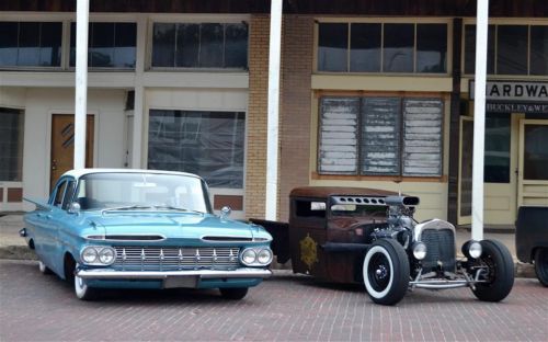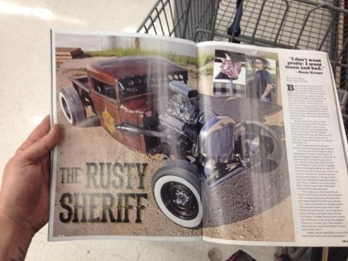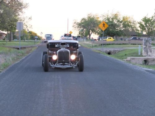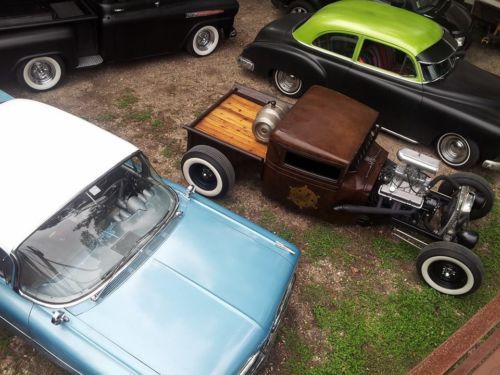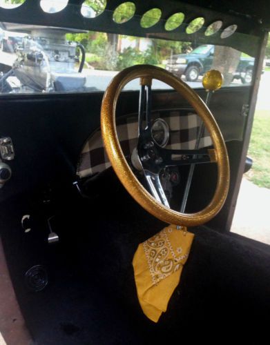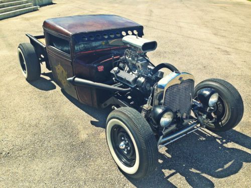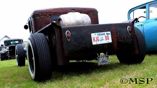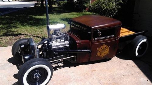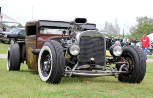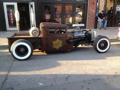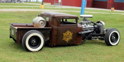 This 1931 Chevy pickup named "THE RUSTY SHERIFF" is chopped a total of 8 inches. It's themed after an old rusty sheriffs truck with a sheriff's badge from 1931 welded right to the front from the western series Hopalong Cassidy. It's built on a 2x3 Square Tube chassis, 13" Z'ed in rear and 7" up front. Front end is a 4" drop tube axle, Chevy spindles, with late 70(caprice, impala) rotors calipers and pads. It has a transverse spring up front for a total of 5" of drop. Steering is traditional style with a 1950 Dodge truck gear box. Motor is a fresh build, bored 30 over with a GM 1182 forged crank X rods and Speedpro forged flat top pistons. Comp Cam 272, 471 lift-very streetable. It has a Wieand high-rise intake with a Eldebrock 650 carb, Accell billet distributor. TH350 Tranny with a shift kit, alto clutches and corvette servo with a 1900 to 2500 stall converter. Rear end is from a 70 El Camino with 308 gears. Truck has a basic alarm with shock sensor for those car shows out of town and your ride has to sit outside in that shady hotel parking lot. Clean title as a 1976 Chevy Vega from the Doner car, where it all began. Black carpet floor, with gorilla style furr over tranny tunnel and on the roof. Seating is a black metal flake custom made bench style seat. Painted black dash with speedometer (cable not installed) below dash are the gauges for the oil pressure/Temp/voltage.... Ignition toggle mounted on dash along with a switch that controls high and low beams, and another switch that controls Taillights and dash lights. Small horn button controls Ahhooga horn mounted under the bed of the truck. Gas tank is a vintage FireStone keg that hold 15.5 gallons. Truck weighs just under 2k pounds with me in it. It doesnt take much for this thing to get after it. Awesome gas mileage too. Bed of the truck has a solid built metal frame structure with a wooden board over that and on top of that are fence pickets cut to size then treated to look like a vintage wooden bed. Gold metal flake steering wheel (detachable for security) and matching gold flaked shift knob. The tallest part of the truck stands 48 inches, Its mean,low,loud and fast. Comfort is sacrificed for style. I have driven this truck hundreds of miles to and from shows with out an issue every time. I trust this truck to drive anywhere. Im 6'0 tall and 215lbs and fit in here just fine. Sit in it like a Go-Kart, drive with both feet and hold on, cause this one books it down the highway. Low maintenance on a truck like this with everything out in the open, fluid changes are a breeze. 15 inch steel wheels wrapped in Coker bias ply wide whites. I went with bias ply tires because i like the nostalgic look of them. but if you have never driven a car with bias plys, it takes some getting use to. (they follow any pattern in the road) Truck has been on the Cover and Featured in the #64 July issue of OL' SKOOL RODZ still on the shelves in some stores. Was used on the tv series HGTV'd to lead the cast to the set of the show in the intro. Was also used in multiple Discover channel Outlaw Garage episodes with Jesse James when he was with Austin Speed Shop. Small write up in RAT ROD MAGAZINE and other local mags. Used in LUCKY 13 BRAND photo shoot, the list goes on. Multiple show winner and complete attention getter.