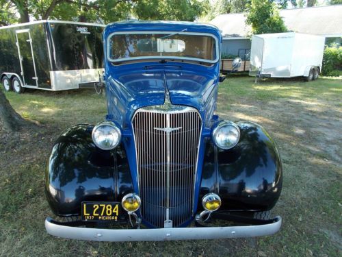 1937 Chevrolet Pickup Truck Here is a nice road ready driver...The Str-6 in this Chevy is a good runner with no obvious issues...Recently there was a new carb and fuel pump installed...The gas tank is clean and sealed...Tires have life and turn signals along with all lights and gauges do work...There are helper springs on the back and elect is 12-volt and it has working CD-player...Over the 4th weekend the truck was taken on a 150-mile tour and drove out as expected (no problems)... The body is solid and the paint is fair...It has a shine but there are areas of orange peal...There is a crack in the right rear pass window...Lic plate shown is not included... Test drives or inspections are available during normal business hours...For more information you can call 734-241-9403... The Reserve has been set at reason $12,500.00... All Sales are Final and As Is...Buyer is responsible for any applicable tax or title fees...Shipping or vehicle pickup is also buyers responsibility...Full Payment is due within 7 days of end of auction... |