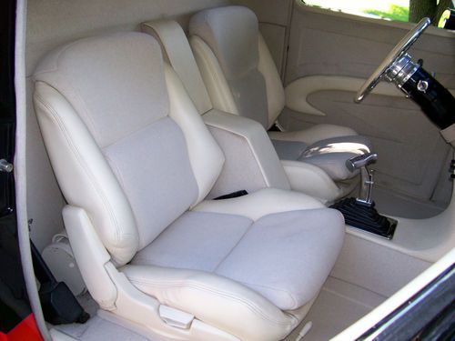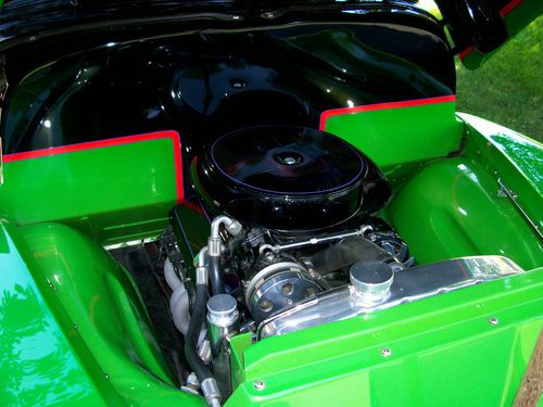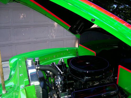 DRIVE TRAIN: Mustang II front suspension with Olds rotors and Ford calipers. Nova 10 bolt rear with Camaro leaf springs. Weld Tomahawk wheels - 15 x 7 15 x 8 with 215/70R15, 255/70R15 tires. 355inch small block, TRW pistons, Crane cam and valve train, Holley intake, Edelbrock 600CFM carb., HEI distributor. Custom painted aluminum 2 piece valve covers. Custom painted Cadillac air cleaner. Headers. Aluminum pulleys, aluminum Street and Performance air and alternator brackets. 350 transmission.