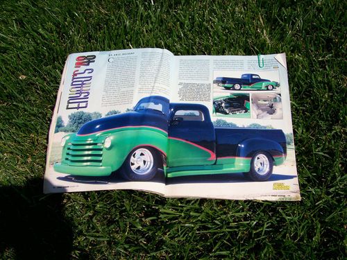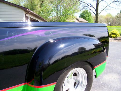 BODY: 1990 Chevy fleet side bed narrowed 15 in., narrowed and molded to bed 48 Chevy rear fenders. Smoothed and extended 48 Chevy running boards. Tailgate smoothed and narrowed 15 in. with built in third brake lights and inside release. Molded roll pan with custom slotted tail lights and frenched license plate. Top chopped 5 in. with V-but windshield. Shaved door handles and trim with remote opener. Smoothed front bumper/molded headlights. GM bullet outside mirrors. Cut down electric wiper assembly. Bear claw door locks - electrically operated. Custom made aluminum hard tonneau cover covered in sculptured black Mercedes convertible top material.
