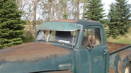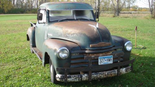 1951 CHEVROLET 3100 SERIES SHORT BOX HALFTON PICKUP! TRUE BARN FIND, HAS BEEN STORED IN A BARN FOR MANY YEARS. WOULD MAKE AN AWESOME RAT ROD, IT HAS THE RIGHT ORIGINAL PATINA ON IT! EVEN HAS ON OLD SUNVISOR ON IT. AND A NOSTALGIA HOOD ORNAMENT, MIRRORS AND A BUMPER/GRILL GUARD. HAS LOTS OF NOSTALGIA! TRUCK ROLLS FINE AND TIRES HOLD AIR, THE MOTOR IS STUCK! TRANNY IS FREE AND IS A 3 SPEED ON THE TREE. HAS SOME DINGS HERE N THERE BUT NOT BAD. I DO HAVE A CLEAR TITLE IN MY NAME AND HAS CURRENT PLATES. WOULD MAKE AN AWESOME RAT RAD OR RESTO PROJECT! I RESERVE THE RIGHT TO END THE AUCTION AT ANY TIME, AND PLEASE FOLLOW THROUGH WITH PAYMENT IF YOU ARE HIGH BIDDER AT THE END! TRUCK HAS NO WARRANTY!!! GOOD LUCK AND HAPPY BIDDING!