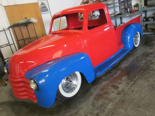 1952 chevy pick up bagged, easy project!!! The pick up is powered by a great running 216 6 cylinder ( perfect for cruzing ), 350 turb automatic trans, tilt column, power steering, power disc brake, drum in rear, independant front susp. ( GM ). The truck has a lot of new parts, new gauges, new wire loom, new lokar shifter, new head light rings, new rubber, new glass, front, and rear ( needs door glass ) new steering wheel, great looking fat white wall tires, hub caps and more. It is bagged all the way around ( needs compressor, and wired ) to finish it. The new paint job was done a while ago then sat it has chips, scratches, etc. still looks ok? ( see pics. ) the seat was also new then sat, and the dog ate half of it?!#!! This project pick up could be back on the road in a very short time with a motivated buyer!!! It is being sold for a lot less than the investment, and needs to be sold!! Questions, please email or call 1-559-906-2295. A 1000.00 deposit is required at the close of auction, and the balance is due with in 7 day's. Shipping is the responsibility of the buyer. Please only bid or offer if you are ready to buy, and can comply with the auction payment guidelines. Truck does have bumpers, brackets, splash apron, etc.