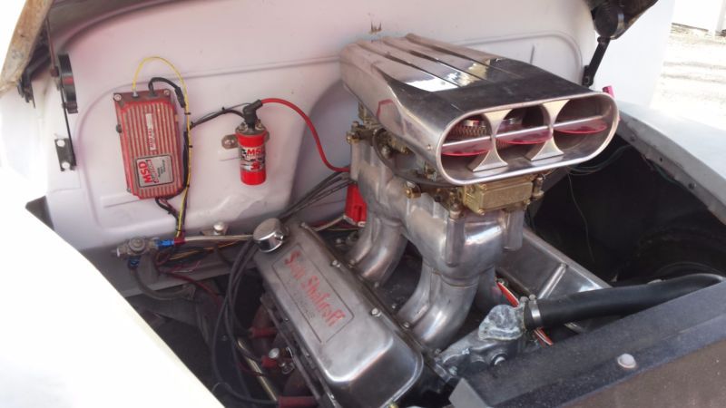 Holley high rise dual quads, Electric fuel pump, 80's Camaro Frame, 24" x 15" Micky Thomas back tires, Have