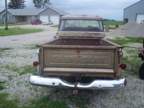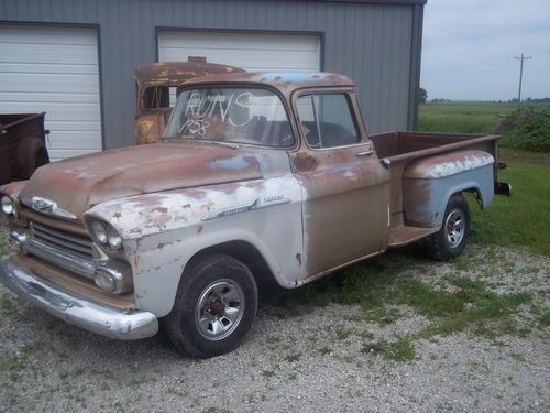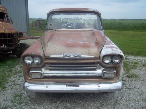 THIS TRUCK DOES NOT HAVE A TITLE IT IS SOLD WITH A BILL OF SALE. The truck you are looking at is 1958 Chevrolet Apache. I bought this with intentions of building it but got to many. The engine does run and the previous owner said it is a 327. I have not checked any numbers so go with it being a V8.All four tires hold air and she rolls and steers good. Please email me if you have any questions. Be sure to see my other auctions.