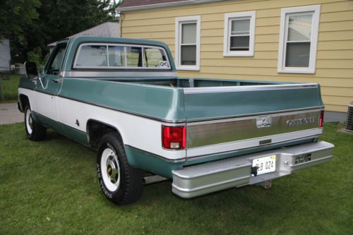 Silverado-20 Camper Special with just over 64k original miles. The green and white paint is in very good condition with minor imperfections. I purchased the truck in March from the original 81 year old owner. This truck is very well maintained and runs and drives excellent. Never been in snow and garage kept year round. New tires purchased last year. Recently installed new master cylinder and new exhaust system. Inside