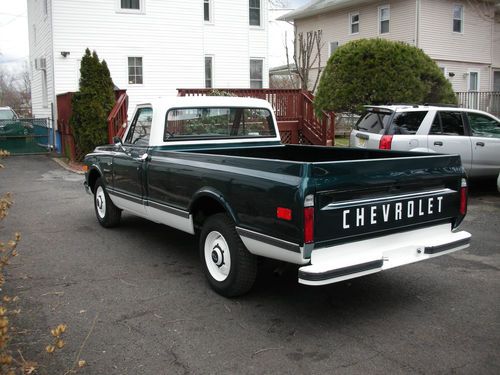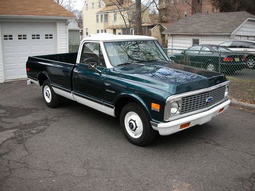 1971 Chevrolet Pickup Customer C20 Emerald Green Pearl Metallic Two Tone with White. 74,043 miles with an original 350 engine, 400 Transmission, Power Steering and Power Brakes. Frame off restoration with lots of new parts installed. This truck was taken down to the frame and redone, you must see this truck to really appreciate it. THE TRUCK RUNS GREAT!! SECOND OWNER TRUCK, purchased from a retired fireman who had truck sitting around.