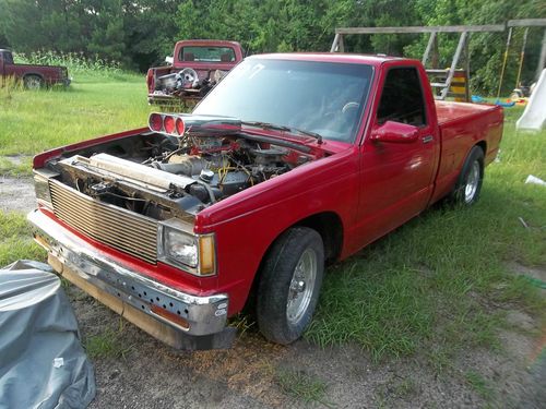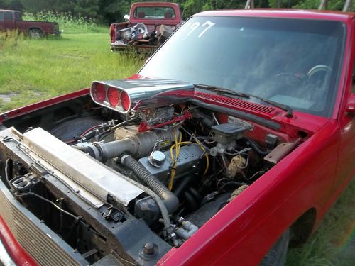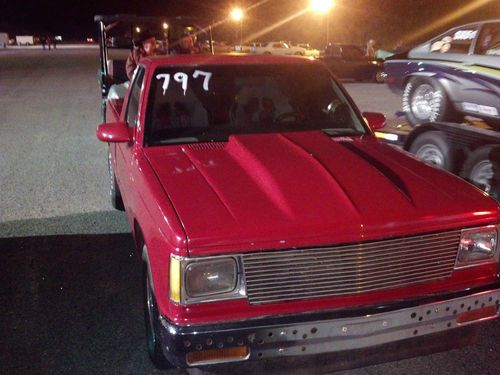 Up for auction is an '82 S-10. It has a .40 350 with Brodix Race Rite aluminum heads roller cam and a Weiand 142 blower. It has a ford 9" with disk brakes, and I think a 4:10 or 4:11 gear not 100% sure. I have never had to take the rear end apart. It still needs a little tlc. The cage is not done, and it has a couple leaks. I have owned this truck two years and only able to race it three times. It always shoots strait as an arrow. i know I am leaving out alot of info just ask and i'll tell you what I know. I do have have a clear blue Texas title in my name. It could be made street legal with little trouble.