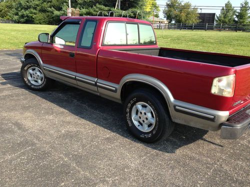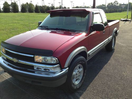 You are looking at a 1998 Chevy S-10 4x4 automatic 4.3 liter v-6 engine extended cab truck . I am a small car lot in Georgetown KY 40324 we took this this low miles truck in on trade of another truck. When we got it had new Exhaust ,newer tires Shocks. Truck runs and drives good we did have a new battery installed the next day after we traded for it. Please call me 502-889-6180 for more information on this nice truck. Air seems to blow warm and there is two loose bolts that hold on the top piece to the roof. WE DON'T CHARGE DOC FEE LAST BID IS WHAT YOU PAY. You will have to pay you own SALES Taxes in your home state.