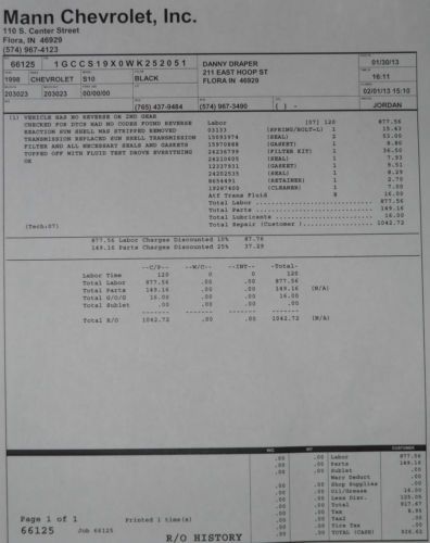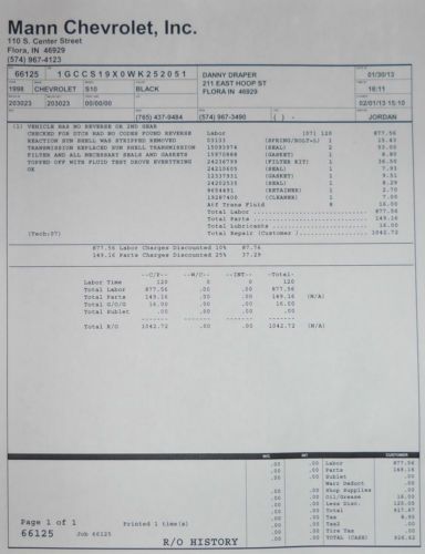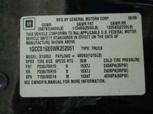 ***Up For Auction 1998 4.3L CHEVY S10 CREW CAB TRUCK*** I bought the truck off my neighbor on 7/12, He had the engine rebulit at 160,000 miles. there is 208048 miles on the truck now. 48048 auctual miles on rebuilt motor. I had the transmission serviced on 1/13 at my local chevy dealer, see copy of work order in the posted photos. Total cost of repairs done $1,042.72 Black Ext. with Gray Int. Tinted Windows at 5% Allowable Maximum according to Indiana law. 4 Newer Tires and 2 more never mounted. Bed liner and Tonneau Cover. Window Air Vent Deflectors New in box am/fm/cd Player, New breaks, Resent tuneup, Installed 100,000 Mile / Lifetime Warranty Plugs & Wires The starting bid will be held at $2,200.00 With a buy it now option for $3,000.00 Any questions? Call or text me at (765)421-2201. If you call? Please call after 4Pm Local (Indiana) Time. ***Ask for Dan*** Thank you for looking at my Truck and for your interest. ***Winning Bidder/Buyer is responsible for picking up the Truck or arranging for a transport company*** $500.00 non-refundable deposit is required 48 hours of auction close