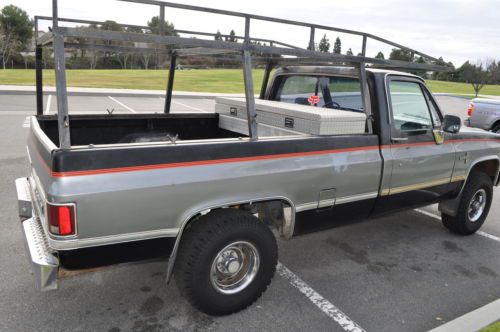 Up for sale is a nice, used 1984 Chevy Silverado 4x4 K10 K1500 with 305 with overdrive automatic transmission. power windows, power locks, tilt wheel, deluxe interior, new dash, new BF Goodrich all terrain tires that have road hazard certificates included, dual exhaust, ladder rack, aluminum tool box, new distributor, new heater core, have newly rebuilt carb. that I will include in the sale not installed yet. This would be a great truck to restore or drive the way it is. Seat needs recovering. Looks to be the original paint, drivers quarter has 2 minor dents and rest of the body looks good and straight, AC needs recharging. Clean California truck! 1984 Chevrolet Silverado Just passed California smog 2 weeks ago, I have a clean California title & smog certificate, and registration is good till Nov. 2014. Feel free to ask questions. GREAT FOR OWNERS WHO LIKE K10 K5 K1500 C10 C20 C30 GMC JIMMY AND BLAZER