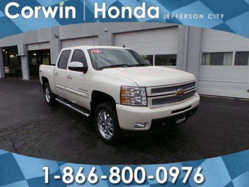 Chrome Essentials Package (Polished Exhaust Tip), Chrome Package (Highly Polished Exhaust Tip), Heavy Duty Cooling Package (Heavy-Duty Air-to-Oil External Engine Oil Cooler), Heavy-Duty Trailering Package (Heavy-Duty Rear Automatic Locking Differential), LTZ Equipment Group (Body-Colored Bodyside Moldings, Body-Colored Power Heated Outside Rear-View Mirrors, Bose Premium Audio Speaker System, Driver & Front Passenger Illuminated Visor Mirrors, Dual-Zone Automatic Climate Control, Electric Rear-Window Defogger, Electronic Autotrac Transfer Case, Floor Console w/Dual Cup Holders, Front Halogen Fog Lamps, Inside Auto-Dimming Rear-View Mirror, Leather-Wrapped Steering Wheel, Power Door Locks w/Remote Keyless Entry, Remote Vehicle Starter System, Solar-Ray Deep-Tinted Glass, and Steering Wheel Mounted Audio Controls), Silverado 1500 LTZ, 4D Crew Cab, White Diamond Tricoat, AWD / 4x4/ 4 wheel Drive, Bodyside Moldings w/Chrome Accent, Heated & Cooled Driver & Front Passenger Seats, Like New!, LTZ White Diamond Edition, Power Sunroof w/Express-Open, Power-Adjustable Pedals For Accelerator & Brake, Sunroof / Moonroof/ Roof / Panoramic, and Universal Home Remote. New Arrival!Don't pay too much for the luxury truck you want...Come on down and take a look at this fantastic 2012 Chevrolet Silverado 1500. Leather upholstery and soft-touch surfaces, upgraded instrument panel featuring wood inlays, dual-zone automatic climate controls, remote engine start and an impressive BOSE Audio System with 6-disc CD changer.www.corwinhondajeffcity.com Outstanding selection of Used Vehicles, Financing serving Jefferson City, Columbia, Lake Ozark, Sedalia, Boone County, Callaway County, Moniteau County, Cole County, Osage County, Rolla, Fort Leonard Wood, Moberly, Marshall, Fulton, Mexico, Missouri, Kansas City, St Louis, Springfield, and CamdentoN. Corwin Honda of Jefferson City has a terrific selection of high quality pre-owned vehicles of all makes and models. All of our pre-owned vehicles have been inspected, so you can drive with confidence! Come see the Corwin Difference today! Right on the price. Right on Missouri Boulevard, Jefferson City.