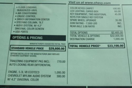 Silver Ice Metallic exterior and Vinyl, Jet Black / Dark Ash, Interior Trim interior, Work Truck trim. EPA 23 MPG Hwy/16 MPG City! AND MORE!======: Approx. Original Base Sticker Price: $33, 100*. ======KEY FEATURES INCLUDE: iPod/MP3 Input MP3 Player, Electronic Stability Control, 4-Wheel ABS, 4-Wheel Disc Brakes, Tire Pressure Monitoring System. ======OPTION PACKAGES: ENGINE, 5.3L FLEXFUEL ECOTEC3 V8 WITH ACTIVE FUEL MANAGEMENT, DIRECT INJECTION AND VARIABLE VALVE TIMING includes aluminum block construction with Flex Fuel capability, capable of running on unleaded or up to 85% ethanol (355 hp [265 kW] @ 5600 rpm, 383 lb-ft of torque [518 Nm] @ 4100 rpm; more than 300 lb-ft of torque from 2000 to 5600 rpm), DIFFERENTIAL, HEAVY-DUTY LOCKING REAR, TRAILERING PACKAGE includes trailer hitch, 7-pin and 4-pin connectors, LED LIGHTING, CARGO BOX with switch on center switch bank. Work Truck with Silver Ice Metallic exterior and Vinyl, Jet Black / Dark Ash, Interior Trim interior features a V6 Cylinder Engine with 355 HP at 5600 RPM*. ======EXCELLENT SAFETY FOR YOUR FAMILY: ======WHY BUY FROM US: At the Orr Group in Texarkana, TX we treat the needs of each individual customer. We know that you have high expectations, and as a dealer we enjoy the challenge of meeting and exceeding those expectations each and every time. Allow us to demonstrate our commitment to excellence. Our experienced sales staff is eager to share its knowledge and enthusiasm with you. Sure, the X1 xDrive35i has space for pretty much anything you decide to bring along The CX-9 has communicative steering, really good body control for an SUV Pricing analysis performed on 6/7/2014. Horsepower calculations based on trim engine configuration. Fuel economy calculations based on original manufacturer data for trim engine configuration. Please confirm the accuracy of the included equipment by calling us prior to purchase. Orr Chevrolet in Texarkana is your Chevy Headquarters!*These prices include all applicable rebates through GM for Zip Code 75503. Although rebates are pretty standard everywhere, your location will ultimately determine which incentives you qualify for. We do not include accessories or dealer installed options in our pricing. Please call to confirm trim, mileage, options, and to ensure availability