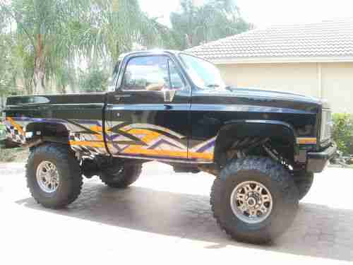 Beautiful 4X4 Custom Chevy, Drives Excellent on or OFF Road. on 39.5x13.50 17 Super Swamper radial IROKs.MileMarker 10K Lb. Hydraulic Winch,Dana60 w/456 front axle,14 bolt 456 Detroit rear.ZZ502 Chevy Crate Motor w/serpentine belt kit. Manual Shift,Turbo 400 w/Trans brake.New Starter,Batteries,Alt. less than 3K on all Mechanical.Looks,Runs Excellent.Drives Great on Highway.Spray in bed liner.2nd fuel tank in rear(as Pictured) Dual Res. Shocks,HydroBoost Brakes,will stop on a Dime.6" lift,3"body lift.1ton suspension.Bullet proof Drivetrain.LOW RESERVE! Could not build engine and trans for this Low Reserve.. BID TO WIN. Gun rack included! Body Very Clean,has some Minor scratches and dings due to Off-Road. between the two tanks about 40 gallons.RUNS ON PUMP GAS!