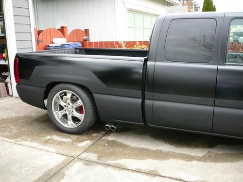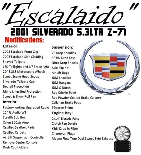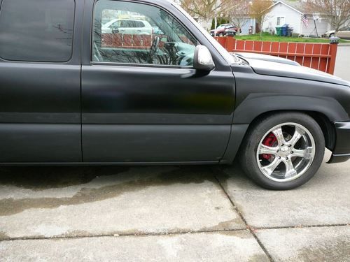 2001 Chevrolet Silverado Escalade Conversion 23K invested in all, This truck is nice and has custom touches all over it. Shaved handles , Shaved Tailgate , Custom Cladding (removed, but will include) , Lowered with spindles and torsion keys in the front and Axle flip, c-notch , hangers and shackles w/Airlift bags in the back. This truck is very trick and sports a 5.3ltr engine with push button 4wd. 101,475 miles and runs smooth, no leaks. All fluids changed regularly. Powder coated brake calipers, new brake pads , slotted & drilled rotors and super blue brake fluid. Magnaflow true dual exhaust swept side with chrome magnaflow tips. Lots of time a effort went into this truck along with lots of money. , A/C ice cold, All scheduled maintenance, Custom paint/graphics, Custom wheels, Fully loaded with all the goodies, Must see, No accidents, Non-smoker, Upgraded sound system.