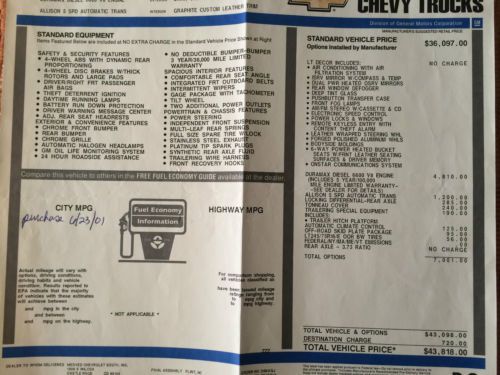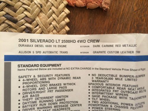 This 2001 Chevy Silverado has the Duramax Diesel 6600 V8 engine with the Allison 5 spd automatic transmission. Original owner, vehicle in excellent condition. Full maintenance records, new fuel injectors and fuel injector pump at 146,000 miles. Top of the line Snugtop topper. Every option available at purchase time is on this truck with the exception of towing lighting package, does include a factory installed tow hitch.