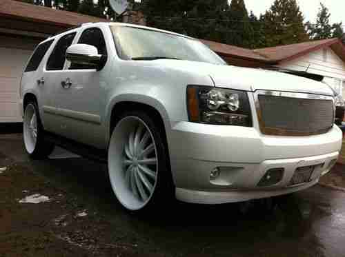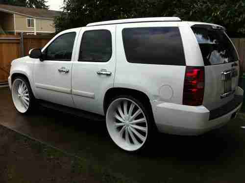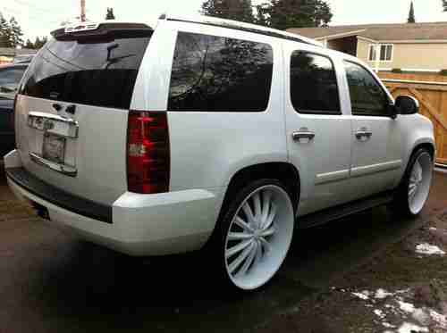 2007 CUSTOM WHITE CHEVY TAHOE, LOWERED 2 INCHS, BRAND NEW CUSTOM 28 INCH WHEELS ON BRAND NEW 295/25/28 TIRES,135K MILES,KENWOOD NAVIGATION DOUBLE DIN DVD IN DASH AND FLIP DOWN ROOF MONITOR,TINTED WINDOWS,HID HEADLIGHTS,CUSTOM GRILL,CLEAN IN AND OUT, RUNS GREAT. GOOD LUCK WITH BIDS.